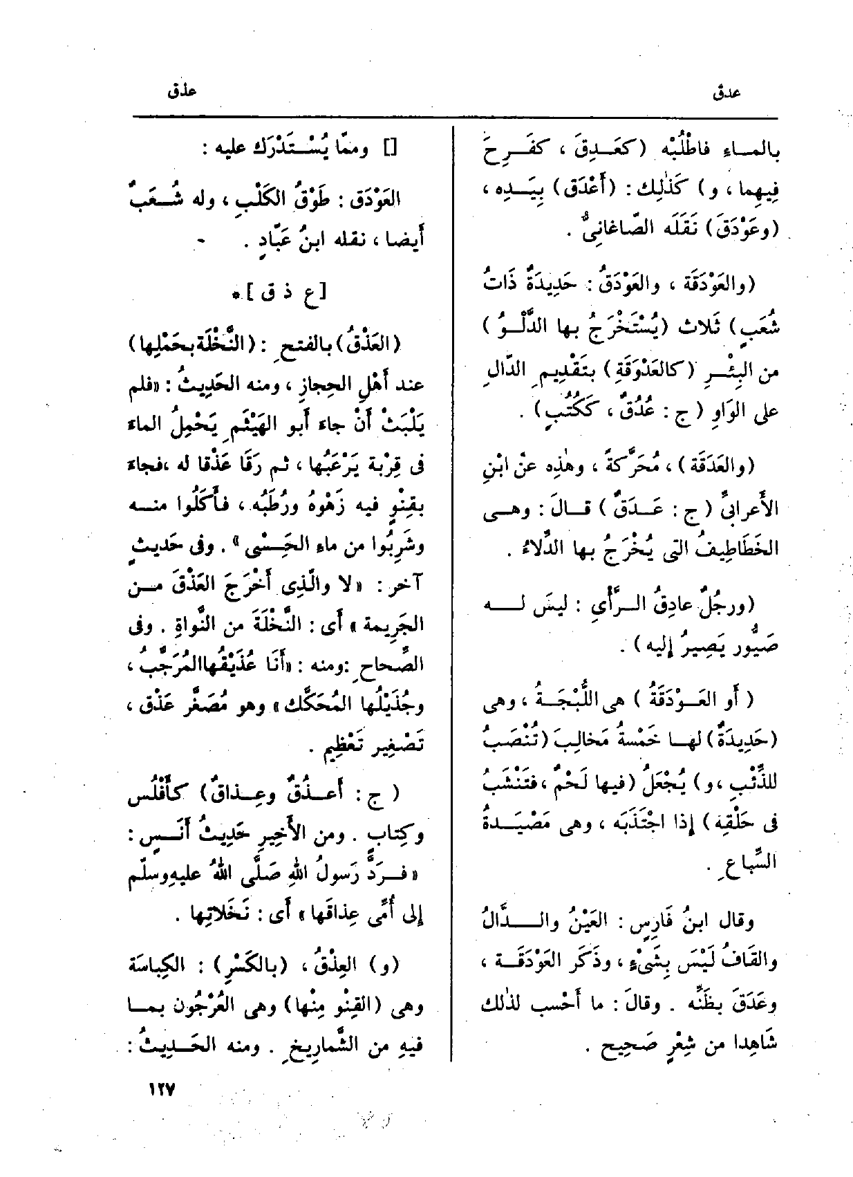 بالماءِ فاطْلُبْه كعدِقَ، كفرِحَ فيهِما، وكذلِك: أعْدَق بيَدِه، وعَوْدَقَ نقَلَه الصّاغانيُّ. والعَوْدَقَة، والعَوْدَقُ: حَديدة ذَات شُعَبٍ ثَلاث يُستَخْرَجُ بهَا الدّلْوُ من البِئْرِ كالعَدْوَقَةِ بتَقْديمِ الدّال على الواوِ ج: عُدُقٌ، ككُتُب. والعَدَقة، محرَّكة، وهذِه عَن ابنِ الأعرابيّ ج: عَدَقٌ قَالَ: وَهِي الخَطاطيفُ الَّتِي يُخرَجُ بهَا الدِّلاءُ. ورجُلٌ عادِقُ الرّأْي: ليسَ لَهُ صَيّور يَصيرُ إِلَيْهِ. أَو العَوْدَقَة هِيَ اللُّبْجَة ف، وَهِي حَديدةٌ لَهَا خمْسةُ مَخالِبَ تُنْصَبُ للذِّئْب، ويُجعَل فِيهَا لحْمٌ، فتنْشَبُ فِي حلْقِه إِذا اجْتَذَبَه، وَهِي مَصْيَدةُ السِّباع.