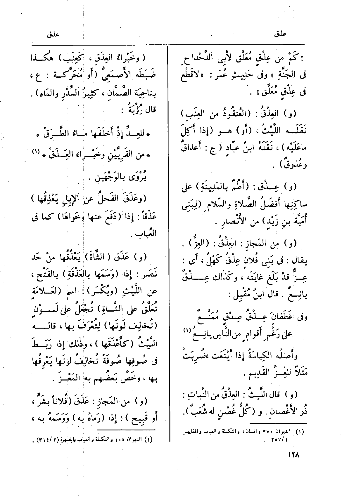 كمْ من عِذْقٍ معَلَّق لأبي الدّحْداحِ فِي الجنّةِ وَفِي حَديث عُمَر: لَا قَطْع فِي عِذْقٍ مُعلَّق. والعِذْقُ: العُنْقودُ من العِنَب نقَلَه اللّيثُ، أَو هُوَ إِذا أُكِل مَا علَيْه، نقَلَهُ ابنُ عبّادٍ ج: أعذاقٌ وعُذوق. وعِذْق: أُطُمٌ بالمَدينَة على ساكنِها أفضَلُ الصّلاةِ والسّلامِ لبَني أميّة بنِ زيْدٍ من الْأَنْصَار. وَمن المَجاز: العِذْقُ: العِزُّ. يُقَال: فِي بَني فُلانٍ عِذْقٌ كهْلٌ، أَي: عِزٌّ قد بلغَ غايتَه، وَكَذَلِكَ عِذْقٌ يانِعٌ. قَالَ ابنُ مُقْبِل: