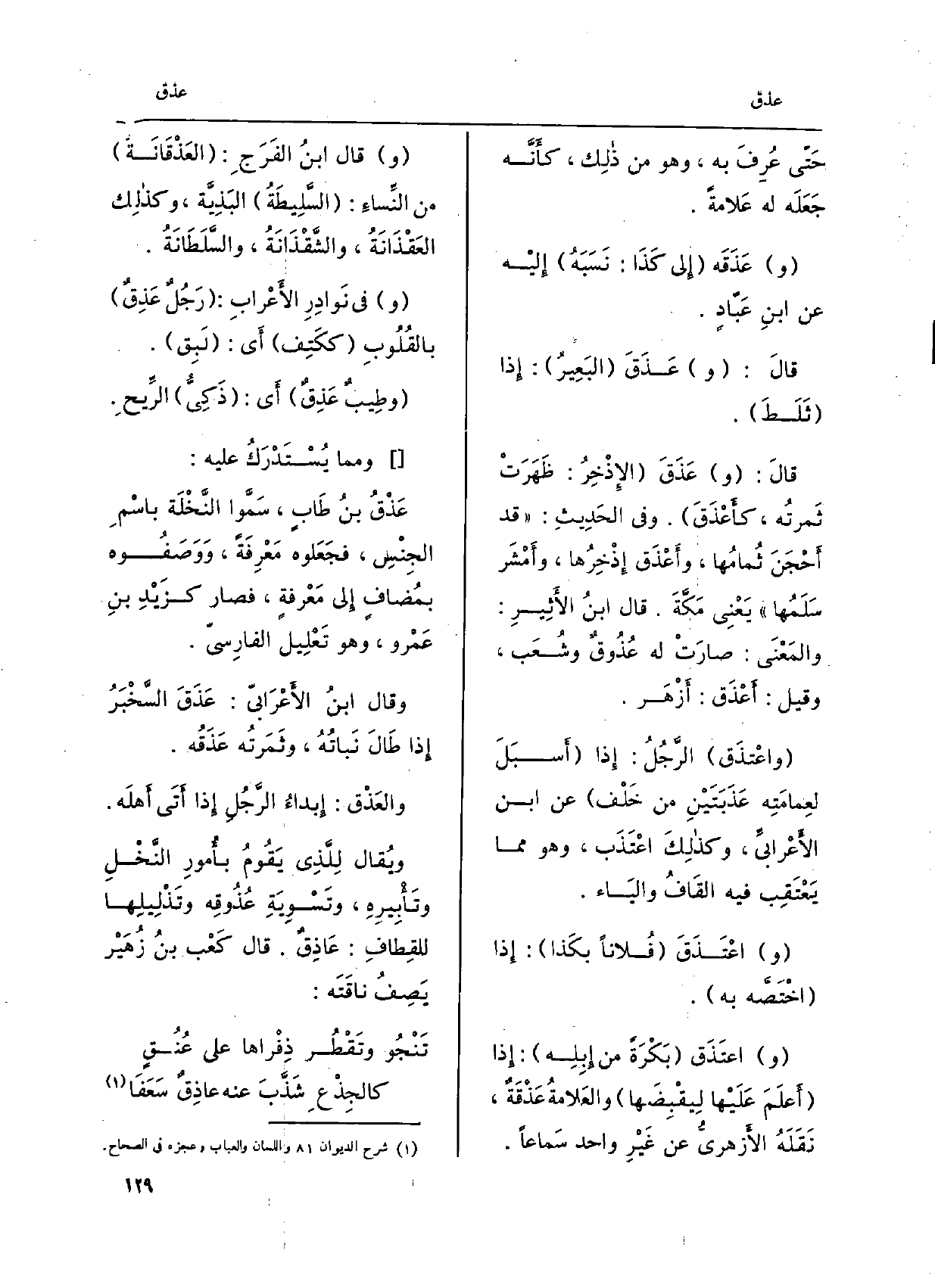 مكّةَ. قَالَ ابنُ الْأَثِير: والمَعْنى: صارَتْ لَهُ عُذوقٌ وشُعَب، وَقيل: أعذَق: أزهَر. واعْتَذَق الرّجُلُ: إِذا أسبَلَ لعمامَتِه عذَبَتَيْنِ من خلْف عَن ابْن الأعْرابي، وكذلِك اعْتذَب، وَهُوَ مِمَّا يعْتَقِب فِيهِ القافُ والباءِ. واعْتَذَقَ فُلاناً بكَذا: إِذا اخْتصّه بِهِ. واعتذَق بكْرَةً من إبلِه: إِذا أعلَمَ علَيْها ليَقْبِضَها والعَلامة عَذْقةٌ، نقلَه الأزهريُّ عَن غيْرِ وَاحِد سَماعاً. وَقَالَ ابنُ الفَرَجِ: العَذْقانَة من النِّساء: السّلِيطَةُ البَذِيّة، وكذلِك العَقْذانَةُ، والشّقْذانَةُ، والسَّلَطانَةُ. وَفِي نَوادِرِ الأعْرابِ: رجُلٌ عذِقٌ بالقُلوبِ ككَتِف أَي: لَبِق. وطيبٌ عذِقٌ أَي: ذكيُّ الرّيح. وَمِمَّا يُستدرَكُ عَلَيْهِ: عذْقُ بنُ طابٍ، سمّوا النّخْلَة باسْمِ الجِنْسِ، فجعَلوه معْرِفةً، ووصَفوه بمُضافٍ الى معرفةٍ، فَصَارَ كزَيْدِ بنِ عَمْرو، وَهُوَ تعْليل الفارسيّ. وَقَالَ ابنُ الأعْرابيّ: عذَقَ السّخْبَرُ إِذا طالَ نباتُهُ، وثمَرَتُه عذَقُه. والعَذْق: إبداُ الرّجُلِ إِذا أتَى أهلَه. ويُقال للّذي يَقومُ بأمورِ النّخْلِ وتأبِيرِه، وتسْويَةِ عُذوقه وتذْليلِها للقِطافِ: عاذِقٌ. قَالَ كعْب بنُ زُهير يصِفُ ناقتَه: