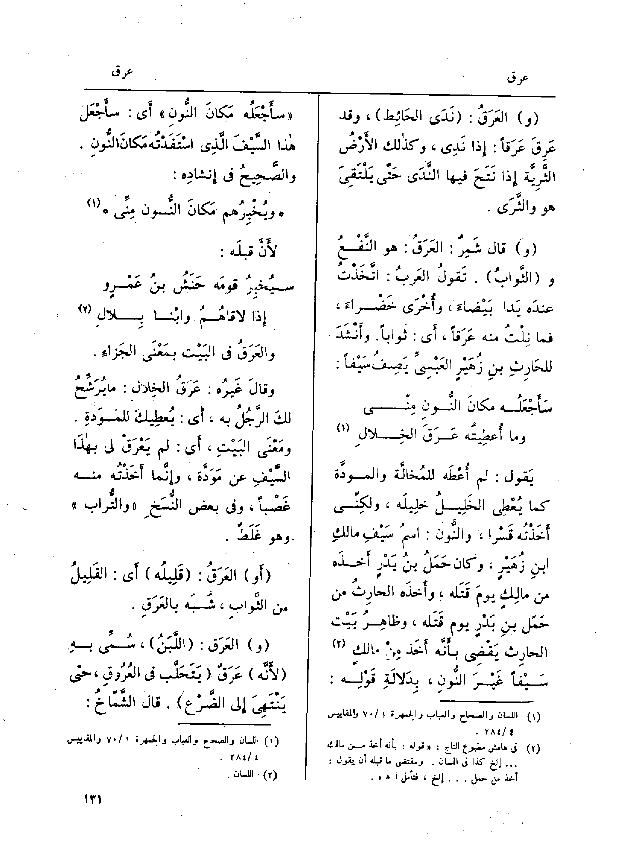 والعَرَقُ فِي البَيْت بمَعْنى الجَزاء. وَقَالَ غيرُه: عرَقُ الخِلال: مَا يُرَشِّحُ لكَ الرَّجُلُ بِهِ، أَي: يُعطيكَ للمَودّةِ. ومعْنى الْبَيْت، أَي: لمْ يعْرَقْ لي بهذَا السّيفِ عَن مودَّة، وإنّما أخذْتُه مِنْهُ غصْباً،)