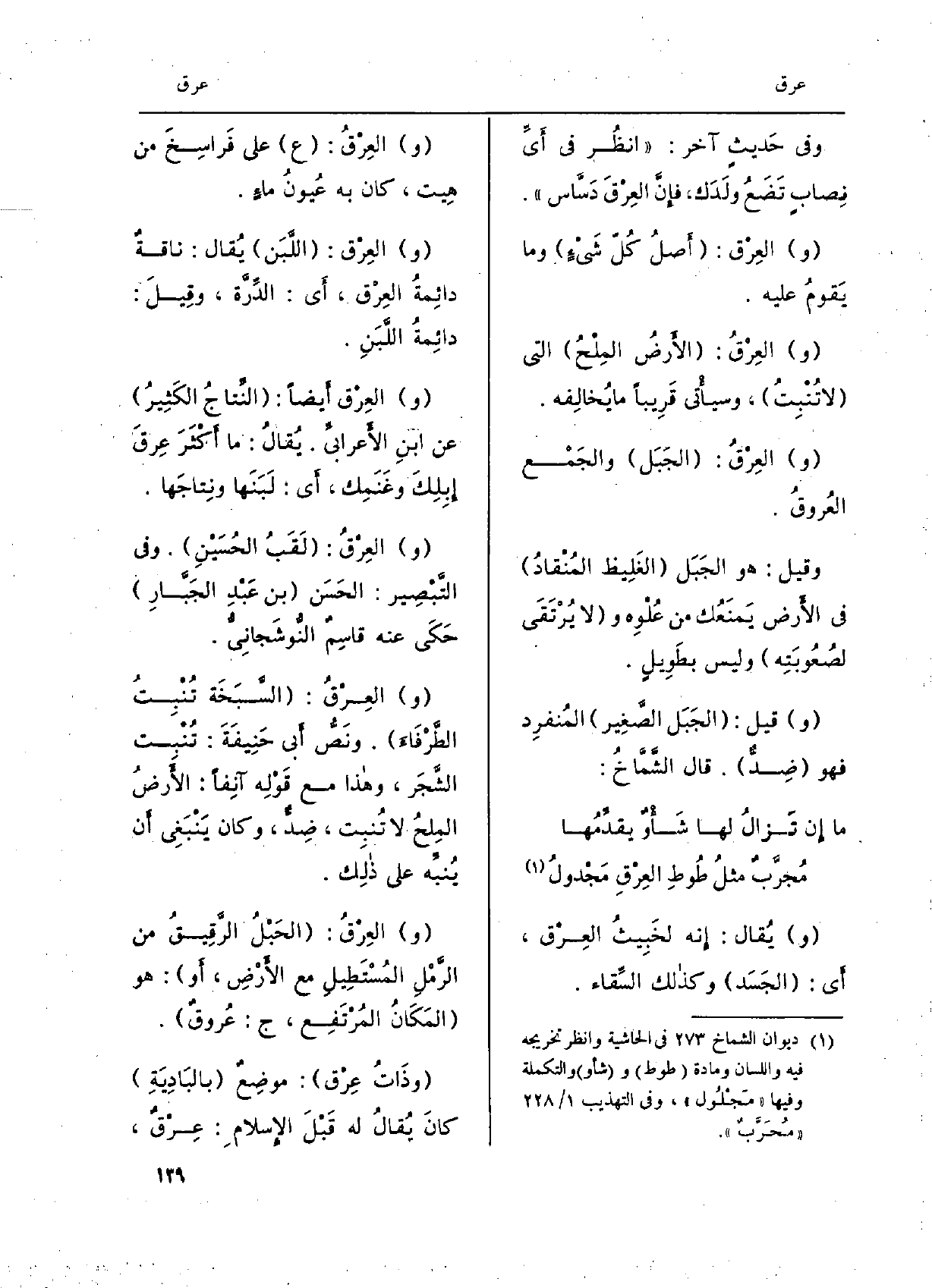 وَفِي حَدِيث آخر: انظُر فِي أيِّ نِصابٍ تضَعُ ولَدَك، فإنّ العِرْقَ دسّاس. والعِرْق: أصلُ كُلّ شيءٍ وَمَا يقومُ عَلَيْهِ. والعِرْقُ: الأرضُ المِلْحُ الَّتِي لَا تُنبِتُ، وسيأْتي قَريباً مَا يُخالِفه. والعِرْقُ: الجبَل والجَمْع العُروق. وَقيل: هُوَ الجبَل الغَليظ المُنْقادُ فِي الأَرْض يمنَعُك من عُلْوِه وَلَا يُرْتَقَى لصُعوبَتِه وَلَيْسَ بطَويلٍ. وَقيل: الجبَل الصّغير المُنفرِد فَهُوَ ضِدٌّ. قَالَ الشَّمّاخ:
