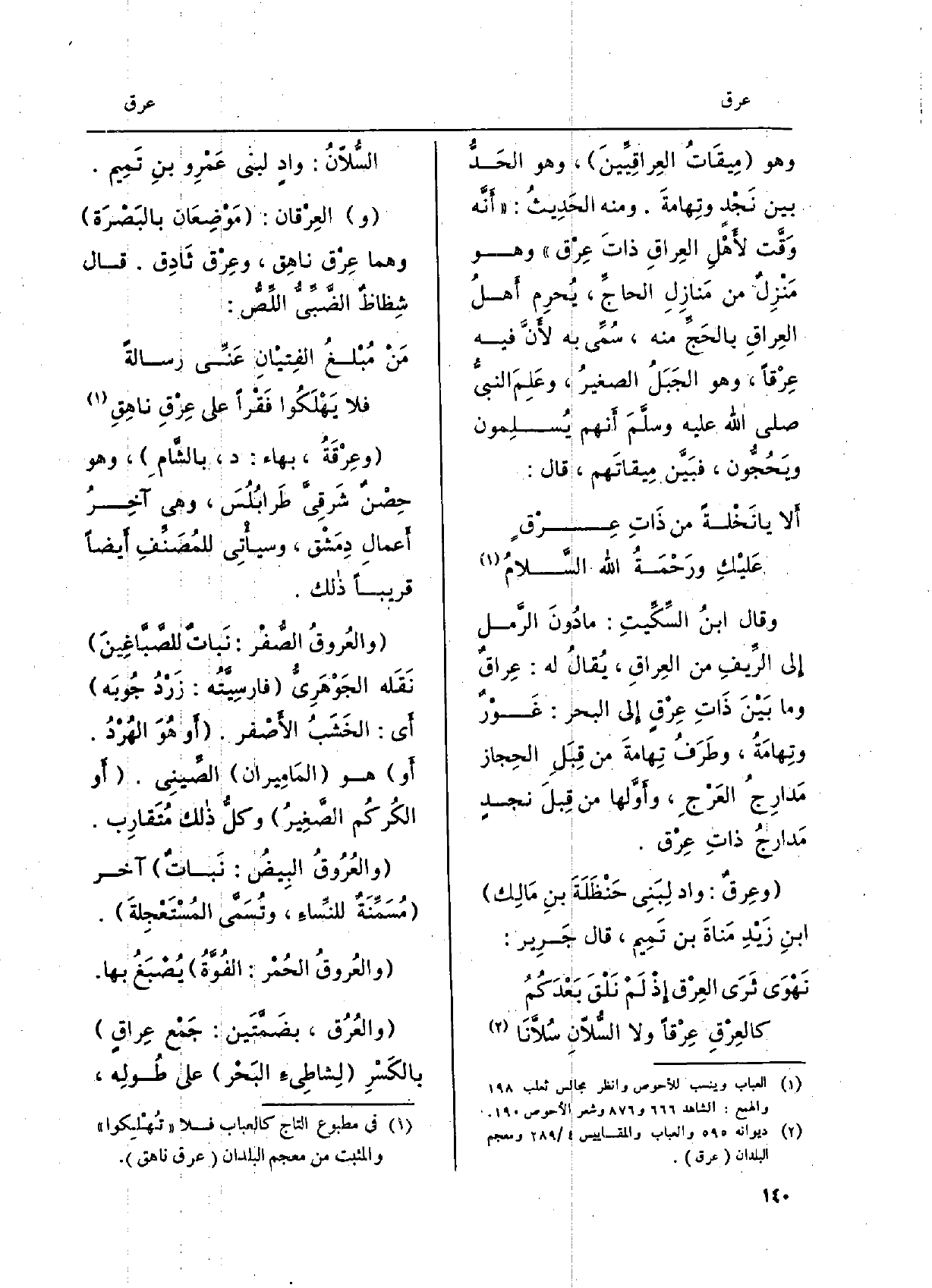 وَقَالَ ابنُ السِّكّيت: مَا دونَ الرّمل الى الرّيفِ من العِراق، يُقال لَهُ: عِراقٌ وَمَا بيْن ذاتِ عِرْقٍ الى الْبَحْر: غوْرٌ وتِهامَةُ، وطرَفُ تِهامةَ من قِبَل الحِجاز مدارِجُ العَرْجِ، وأوّلها من قِبَل نجدٍ مَدارجُ ذاتِ عِرْق. وعِرقٌ: وَاد لبَني حنْظَلَة بنِ مالِك بنِ زيْدِ مَناةَ بن تَميم، قَالَ جَرير: