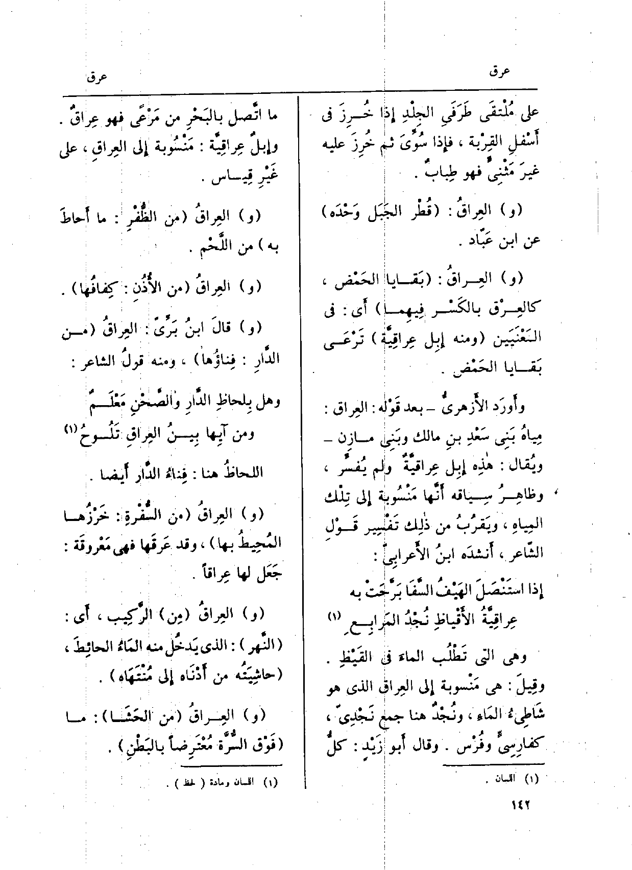 على مُلتَقَى طرَفَي الجِلْدِ إِذا خُرِزَ فِي أسْفَلِ القِرْبة، فَإِذا سُوِّيَ ثمَّ خُرِزَ عَلَيْهِ غيرَ مثْنِيٍّ فَهُوَ طِبابٌ. والعِراقُ: قُطْر الجبَل وحْدَه عَن ابْن عبّاد. والعِراق: بَقايا الحمْض، كالعِرْق بالكَسْر فيهِما أَي: فِي المَعْنَيين وَمِنْه إبِل عِراقيّة ترْعَى بَقايا الحَمْض. وأوردَ الأزهريّ بعد قَوْله: العِراق: مياهُ بَني سعْدِ بنِ مَالك وبَني مازِن ويُقال: هذِه إبِل عِراقيّةٌ وَلم يُفسِّر، وظاهِرُ سِياقه أنّه منْسوبة الى تِلْك المِياهِ، ويَقرُبُ من ذلِك تفْسير قوْلِ الشاعِر، أنشدَه ابنُ الْأَعرَابِي: