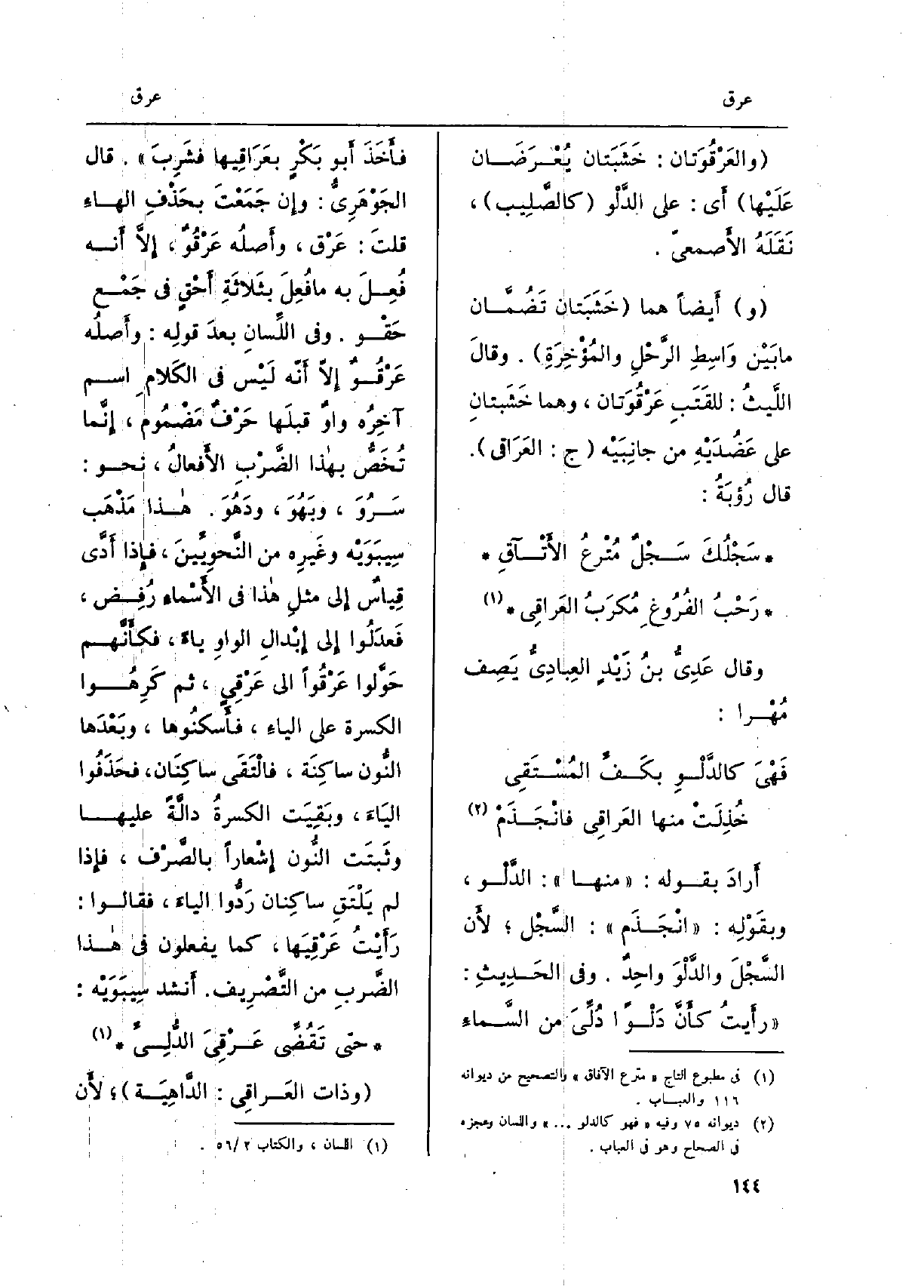 الى عَرْقِي، ثمَّ كرِهوا الكسرة على الياءِ، فأسكنُوها، وبعْدَه النّون ساكِنَة، فالْتَقى ساكِنان، فحذَفوا الياءَ، وبقِيَت الكسرةُ دالّةً عَلَيْهَا وثبتَت النّون إشْعاراً بالصّرْف، فَإِذا لم يلْتَقِ ساكِنان ردّوا الياءَ، فَقَالُوا: رأيتُ عَرْقِيَها، كَمَا يَفْعَلُونَ فِي هَذَا الضّربِ من التّصريف. أنْشد سيبويْه: حَتَّى تَقُضّي عَرْقِيَ الدُلِيّ وَذَات العَراقِي: الدّاهيَة، لِأَن