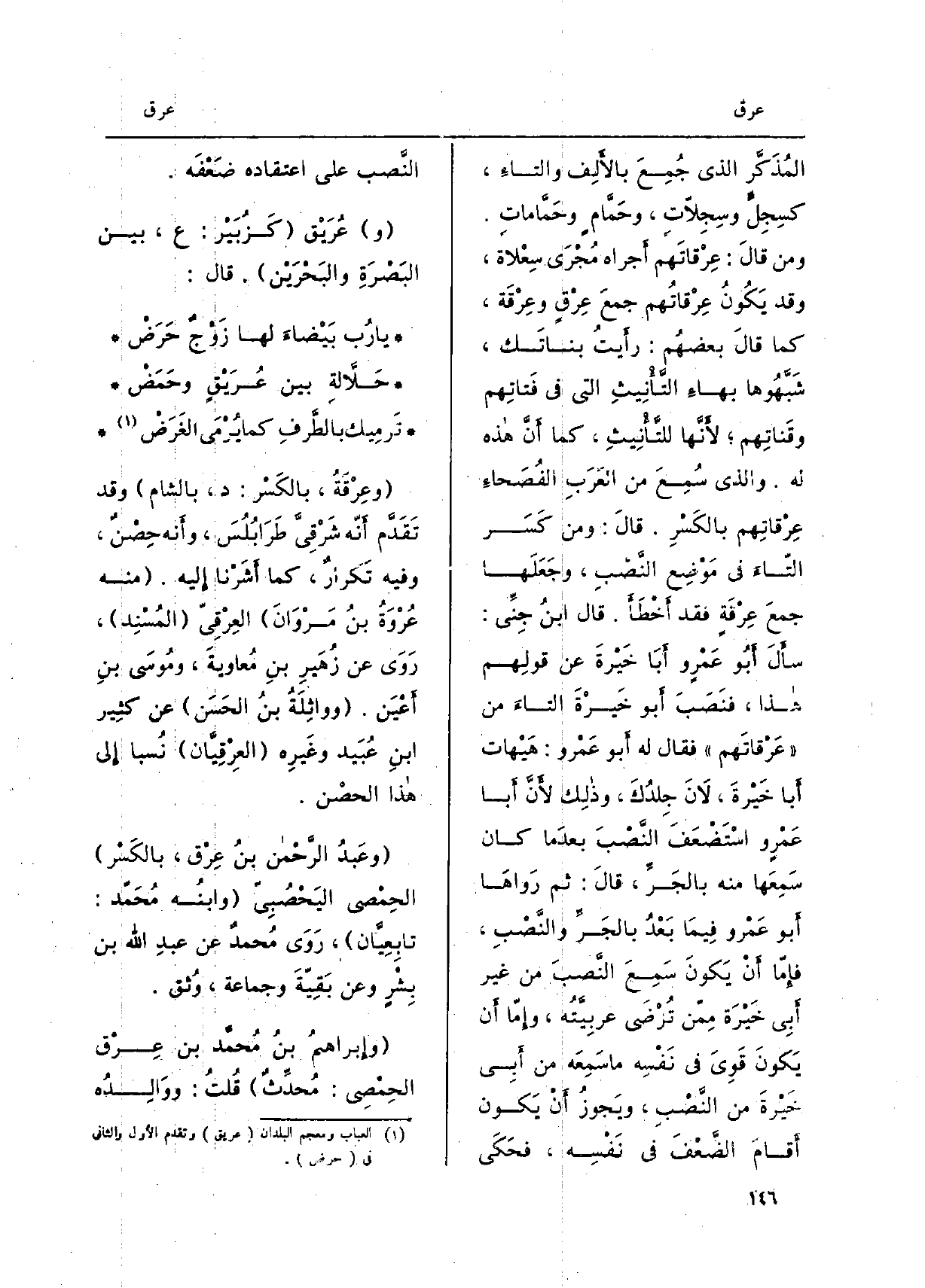 من عَرْقاتَهم فَقَالَ لَهُ أَبُو عَمْرو: هيْهات أَبَا خَيْرَةَ، لانَ جلدُكَ، وذلِك لأنّ أَبَا عَمْر استَضْعَفَ النّصْبَ بعدَما كَانَ سمِعَها مِنْهُ بالجَرِّ، قَالَ: ثمَّ رَواها أَبُو عمر فِيمَا بعْدُ بالجرِّ والنّصْب، فإمّا أَن يكونَ سمِعَ النّصبَ من غير أبي خيْرَة ممّن تُرْضَى عربيّتُه، وإمّا أَن يكونَ قَويَ فِي نفْسِه مَا سمِعَه من أبي خَيْرَة من النّصْبِ، ويجوزُأنْ يكون أقامَ الضّعْفَ فِي نفْسِه، فحكَى النّصب على اعتِقاده ضَعْفَه. وعُرَيْق كزُبَيْر: ع، بَين البَصرةِ والبَحْرَيْن. قَالَ: يَا رُب بَيْضاءَ لَهَا زوْجٌ حرَضْ حَلاّلة بَين عُرَيْقٍ وحَمَضْ تَرميك بالطّرفِ كَمَا يُرْمَى الغَرَضْ وعِرْقَةُ، بالكَسْر: د، بِالشَّام وَقد تقدّم أنّه شرْقِيَّ طرابُلُسَ، وَأَنه حِصْنٌ، وَفِيه تَكرارٌ، كَمَا أشَرْنا إِلَيْهِ. مِنْهُ عُروَةُ بنُ مَرْوَان العِرْقيّ المُسنِد، رَوى عَن زُهَير بنِ مُعاويةَ، وموسَى بنِ أعْيَن.