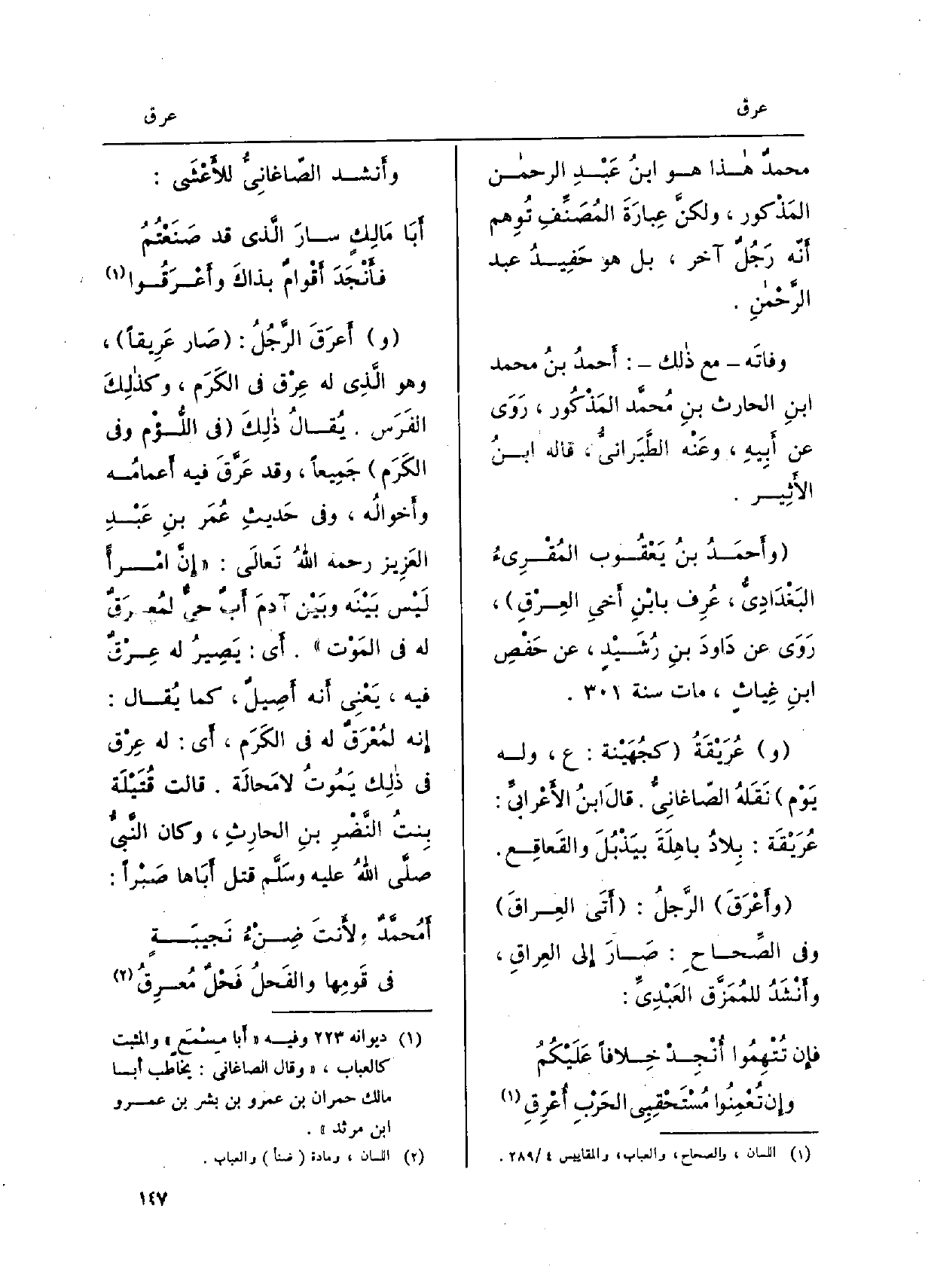 محمدٌ هَذَا هُوَ ابنُ عبْدِ الرَّحْمَن المذْكور، ولكنّ عِبارَةَ المُصَنِّفِ توهِم أنّه رجُلٌ آخر، بل هُوَ حَفيدُ عبد الرّحْمن. وفاتَه مَعَ ذَلِك: أَحْمد بنُ مُحَمَّد بنِ الحارِث بنِ محمّد المَذْكور، رَوى عَن أبيهِ، وعنْه الطَّبَرانيُّ، قَالَه ابنُ الْأَثِير. وأحمَدُ بنُ يعْقوب المُقْرئُ البَغْداديُّ، عُرِف بابْنِ أخي العِرْقِ، رَوى عَن داودَ بنِ رُشَيْدٍ، عَن حفْصِ بنِ غياثٍ، مَاتَ سنة. وعُرَيْقَةُ كجُهَيْنَة: ع، وَله يوْم نقَلهُ الصّاغانيّ. قَالَ ابنُ الْأَعرَابِي: عُرَيْقَة: بِلادُ باهِلَةَ بيَذْبُلَ والقَعاقِع. وأعْرَقَ الرّجلُ: أَتَى العِراقَ وَفِي الصِّحاح: صارَ الى العِراقِ، وأنشدُ للمُمَزَّق العَبْديّ: