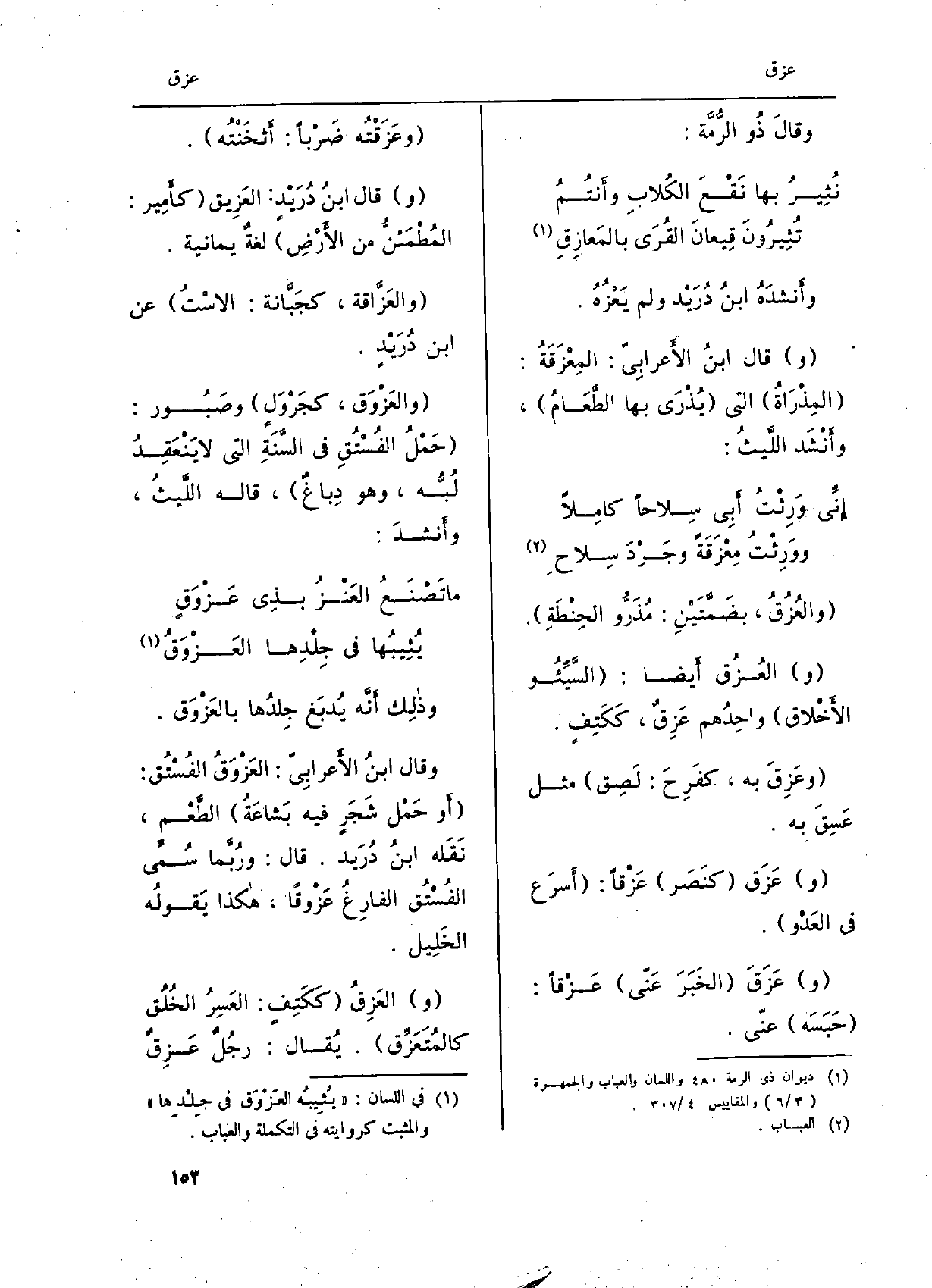 وعزِقَ بِهِ: كفَرِح: لصِق مثل عسِقَ بِهِ. وعزَقَ كنَصَر عَزْقاً: أسرَع فِي العَدْو. وعزَقَ الخَبَرَ عنّي عزْقاً: حَبَسَه عنّي. وعزَقْتُه ضرْباً: أثْخَنْتُه. وَقَالَ ابنُ دُريْد: العَزيق كأمِير: المُطْمَئنُّ من الأرضِ لغةٌ يَمَانِية. والعَزّاقَة، كجبّانة: الاستُ عَن ابنِ دُرَيْد. والعَزْوَق، كجَرْوَل وصَبور: حَمْلُ الفُستُقِ فِي السّنةِ الَّتِي لَا ينْعَقِد لُبُّه، وَهُوَ دِباغٌ، قَالَه اللّيثُ، وَأنْشد:
