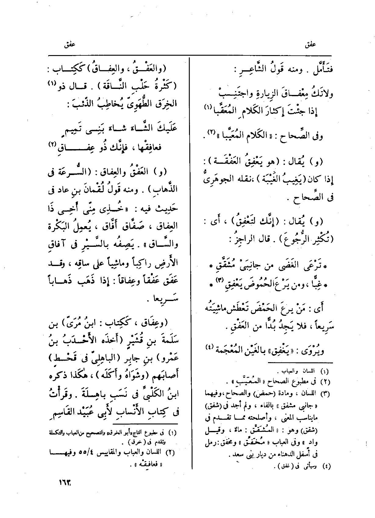 وَفِي الصِّحاح: الكَلام المُعَيَّبا. ويُقال: هُوَ يعْفِقُ العَفْقَة: إِذا كَانَ يَغيبُ الغَيْبَة، نَقله الجوهَريُّ فِي الصِّحاح. ويُقال: إنّك لتَعْفِقُ، أَي: تُكثِر الرّجوعَ. قَالَ الراجِزُ: تَرْعَى الغَضَى من جانِبَيْ مُشَقَّقِ) غِبّاً، وَمن يَرْعَ الحُموضَ يعْفِقِ أَي: مَنْ يرعَ الحَمْضَ تعْطَش ماشِيَتُه سَريعاً، فَلَا يجِدُ بُدّاً من العَفْقِ. ويُرْوَى: يغْفِق بالغَيْن المُعْجَمة. والعَفْقُ، والعِفاقُ ككِتاب: كثْرةُ حَلْبِ النّاقَة. قَالَ ذُو الخِرَق الطُّهَوِيّ يُخاطِبُ الذّئبَ: