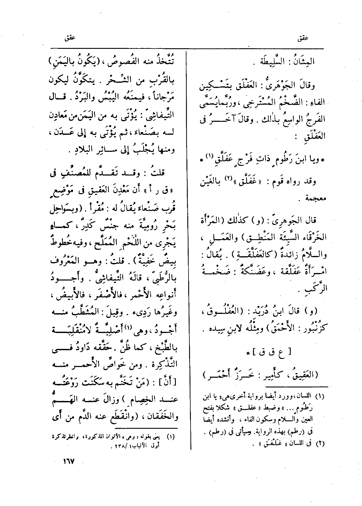 ! العَقيقُ، كأمِير: خَرَزٌ أحْمَر تُتّخذُ مِنْهُ الفُصوصُ، يكون باليَمَن بالقُرْبِ من الشِّحْر. يتكوّن ليَكُون مَرْجاناً، فيمنَعُه اليُبْس والبَرْد. قَالَ التّيفاشِيّ: يُؤْتَى بِهِ من اليَمَن من مَعادِن لَهُ بصَنْعاءَ، ثمَّ يؤتَى بِهِ الى عَدَن، وَمِنْهَا يُجْلَب الى سائِرِ البلادِ. قلتُ: وَقد تقدّم للمصنِّفِ فِي ق ر أأن معدِن العَقيق فِي موضِع قُرب صَنعاءَ يُقال لَهُ: مُقرأ. وبسَواحِل بحْرِ روميّة مِنْهُ جنْسٌ كدِرٌ، كماءٍ يجْري من اللّحْمِ المُمَلَّح، وَفِيه خُطوطٌ بيضٌ خفيّةٌ. قلت: وَهُوَ المَعْروف بالرُّطَبيّ، قالَه التّيفاشيُّ. وأجودُ أنواعِه الْأَحْمَر، فالأصْفر، فالأبيضُ، وغيرُها رَديء. وَقيل: المُشَطَّبُ مِنْهُ أجْوَد، وَهِي أصْليّةٌ لَا مُنقَلِبَة بالطّبْخ، كَمَا ظُنّ. حقّقه داودُ فِي التّذْكِرة. وَمن خَواصّ الْأَحْمَر مِنْهُ أنّ: مَنْ تخَتّم بِهِ سكَنَت روعتُه عِنْد الخِصام وَزَالَ عَنهُ الهمُّ والخَفَقان، وانْقَطَع عَنهُ الدّم من أَي