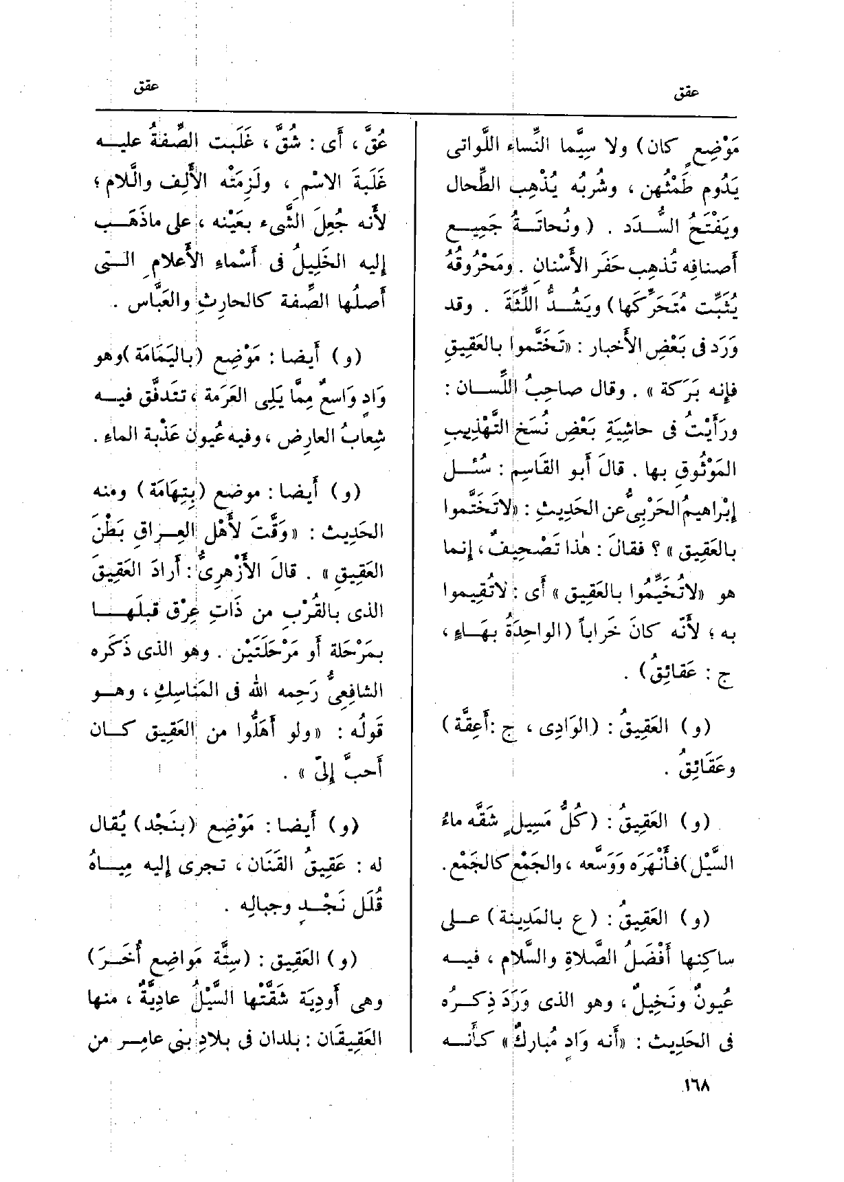والعَقيقُ: ع بالمَدينة على ساكنِها أفضَلُ الصّلاةِ والسّلام، فِيهِ عُيونٌ ونَخيلٌ، وَهُوَ الَّذِي وردَ ذِكرُه فِي الحَدِيث: أَنه وادٍ مُباركٌ كأنّه عُقَّ، أَي: شُقَّ، غلَبت الصِّفةُ عَلَيْهِ غلَبةَ الاسْم، ولزِمَتْه الألِف واللاّم لِأَنَّهُ جُعِلَ الشّيء بعَيْنه، على مَا ذهَب إِلَيْهِ الخَليلُ فِي أسْماءِ الأعْلامِ الَّتِي أصلُها الصّفة كالحارِث والعبّاس. وَأَيْضًا: موضِع باليَمامَة وَهُوَ وادٍ واسعٌ ممّا يَلي العرَمة، تتدفّق فِيهِ شِعابُ العارِض، وَفِيه عُيون عذْبة الماءِ. وَأَيْضًا: مَوضِع بتِهامَة وَمِنْه الحَدِيث: وقّتَ لأهْل العِراقِ بطْنَ العَقيق. قَالَ الأزهريُّ: أرادَ العَقيقَ الَّذِي بالقُرْبِ من ذاتِ عِرْق قبلَها بمَرْحَلة أَو مرْحلَتَيْن. وَهُوَ الَّذِي ذكَره الشافِعيُّ رحِمه الله فِي المَناسِك، وَهُوَ قَوْله: وَلَو أهَلّوا من العَقيق كَانَ أحبَّ إليّ. وَأَيْضًا: موضِع بنَجْد يُقال لَهُ: عَقيقُ القَنان، تجْرِي إِلَيْهِ مياهُ قُلَل نجْدٍ وجِبالِه.