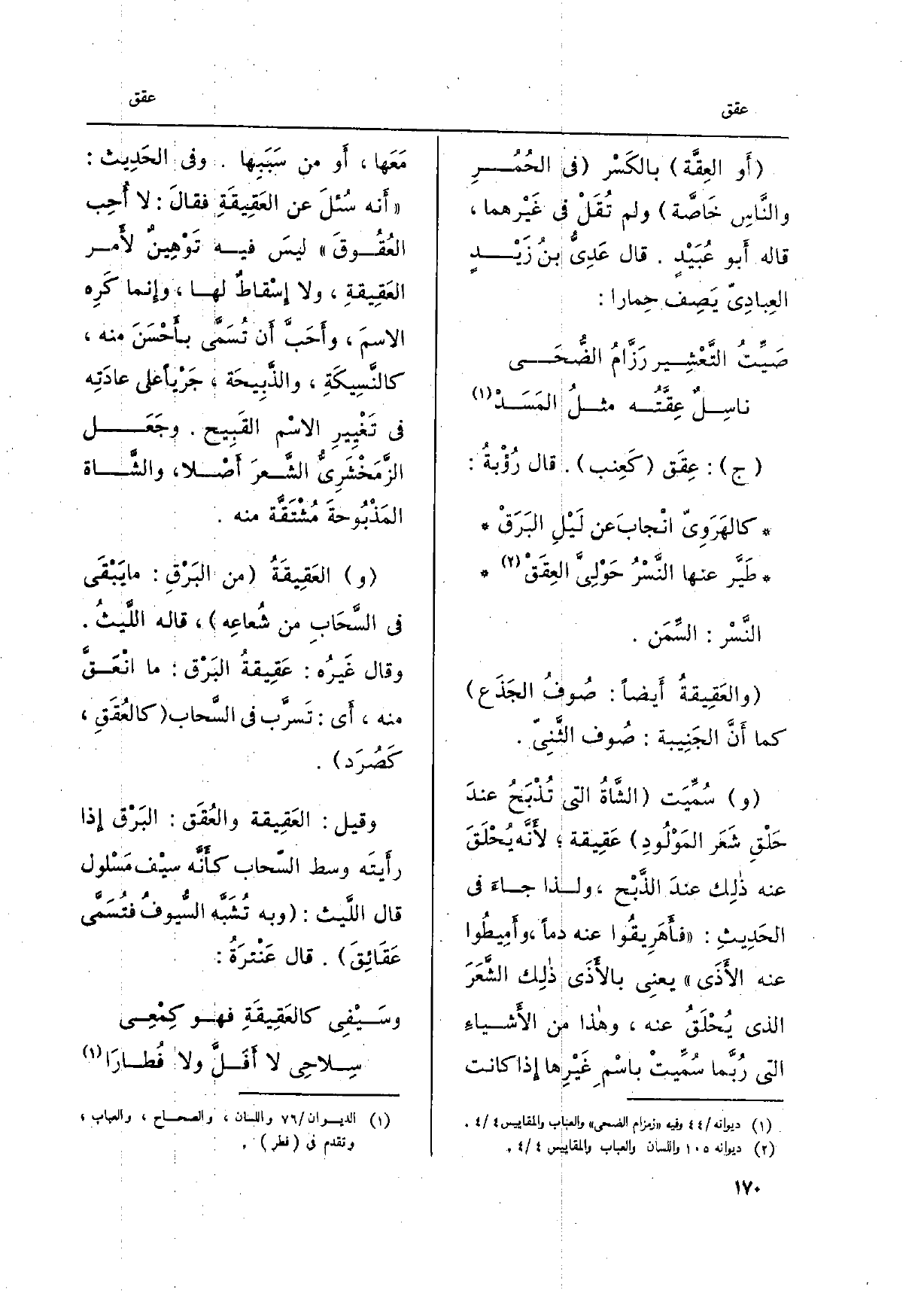 وجعَل الزّمَخْشَريُّ الشَّعر أصْلاً، والشّاة المذبوحةَ مُشتَقّة مِنْهُ. والعَقيقَةُ من البَرْقِ: مَا يبْقَى فِي السَّحابِ من شُعاعِ، قَالَه اللّيثُ. وَقَالَ غيرُه: عَقيقةُ البَرْق: مَا انْعقّ مِنْهُ، أَي: تسرّب فِي السَّحاب كالعُقَقِ، كصُرَد. وَقيل: {العَقيقة} والعُقَق: البَرْق إِذا رأيتَه وسط السّحاب كأنّه سيْف مسْلول قَالَ اللّيث: وَبِه تُشَبَّه السّيوفُ فتُسمّى عَقائِقَ. قَالَ عنْتَرَةُ: