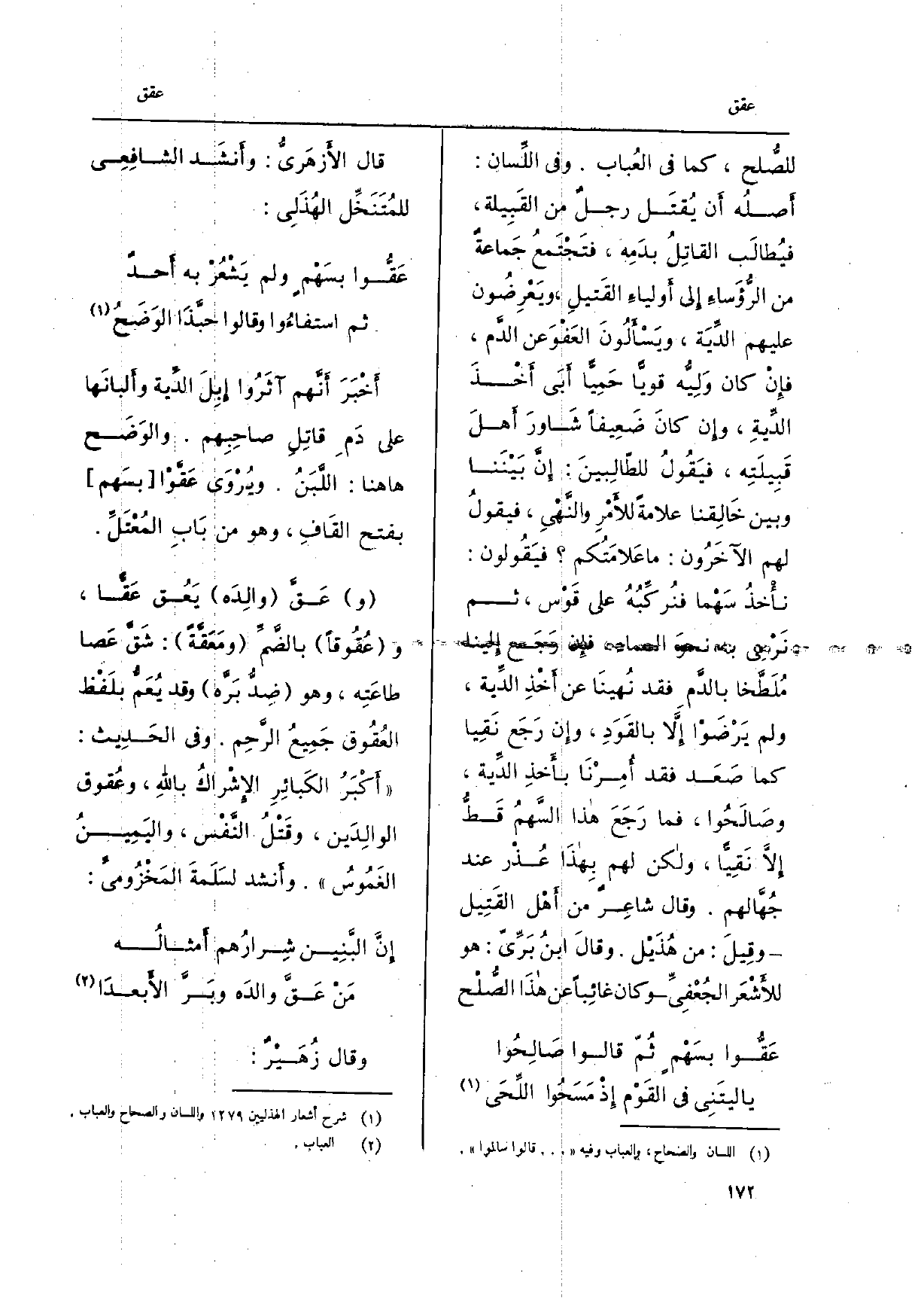 أخْبَرَ أنّهم آثَروا إبِلَ الدِّيَة وألبانَها على دمِ قاتِل صاحِبهم. والوَضَح هَاهُنَا: اللّبَن. ويُروى عقّوا بسَهم بِفَتْح الْقَاف، وَهُوَ من بابِ المُعْتَلّ.} وعقَّ والِدَه {يعُق} عقًّا، و {عُقوقاً بالضّمِّ} ومَعَقّة: شَقّ عَصا طاعَتِه، وَهُوَ ضِدُّ بَرَّه وَقد يُعَمّ بلَفْظ العُقوق جميعُ الرّحِم. وَفِي الحَدِيث: أكبَرُ الكَبائِر الإشراكُ بِاللَّه، وعُقوق الوالِدَين، وقَتْلُ النّفْس، واليَمين الغَموس. وَأنْشد لسَلَمة المخْزوميّ: