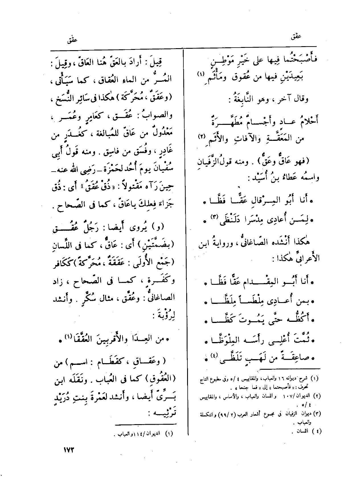 صاعِقَةً من لَهَبٍ تلظّى قيل: أَرَادَ} بالعَقّ هُنا {العاقّ، وقيلَ: المُرُّ من الماءِ} العُقاق، كَمَا سَيَأْتِي، {وعَقَقٌ، مُحرَّكة هَكَذَا فِي سائِر النُسَخ، وَالصَّوَاب:} عُقَق، كعامِرٍ وعُمَر، معْدولٌ من عاقّ للمُبالغة، كغُدَرٍ من غادِرٍ، وفُسَق من فاسِق. وَمِنْه قَول أبي سُفْيان يومَ أُحُد لحَمْزَة رَضِي الله عَنهُ حِين رَآهُ مقْتولاً: ذُقْ عُقَقُ أَي: ذُق جَزاءَ فِعلِك يَا {عاَقّ، كَمَا فِي الصِّحاح. ويُروى أَيْضا: رجُلٌ عُقُق بضمّتين أَي: عاقٌّ، كَمَا فِي اللّسان جمْع الأولى:} عقَقَة، مُحرَّكَة ككافر وكفَرة، كَمَا فِي الصّحاح، زَاد الصاغانيّ: {وعُقَّق، مِثَال سُكَّر. وَأنْشد لرؤْبَة: من العِدا والأقربينَ} العُقَّقا {وعَقاقِ، كقطام: اسْم من} العُقوقِ كَمَا فِي العُباب. ونقلَه ابْن بَرّي أَيْضا، وَأنْشد لعَمْرة بنتِ دُريد ترْثيه: