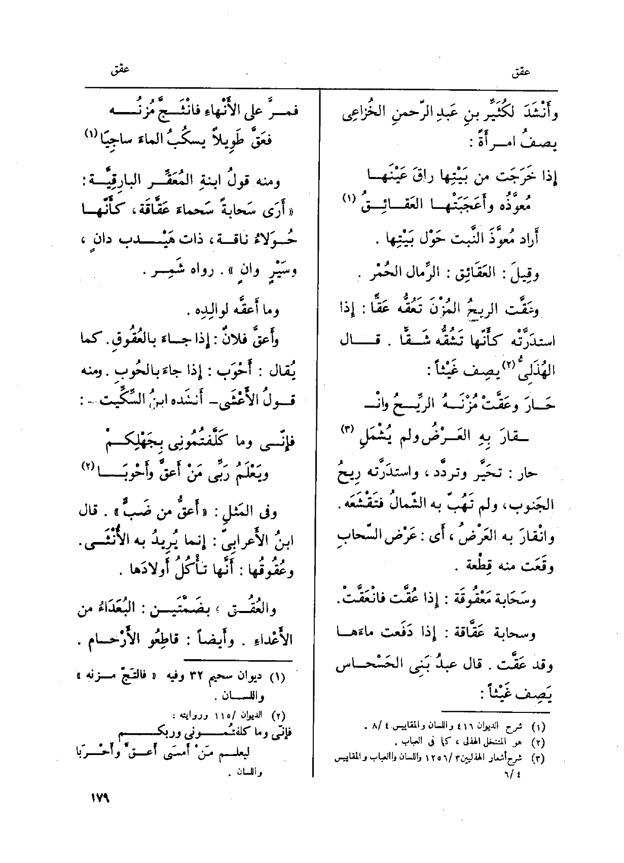 أَرَادَ معوَّذَ النّبت حوْل بيتِها. وقيلَ: العَقائِق: الرِّمال الحُمْر. وعقّت الريحُ المُزْنَ} تعُقُّه {عَقّاً: إِذا استدرّتْه كأنّها تشُقُّه شقّاً. قَالَ الهُذَليُّ يصِف غيْثاً: