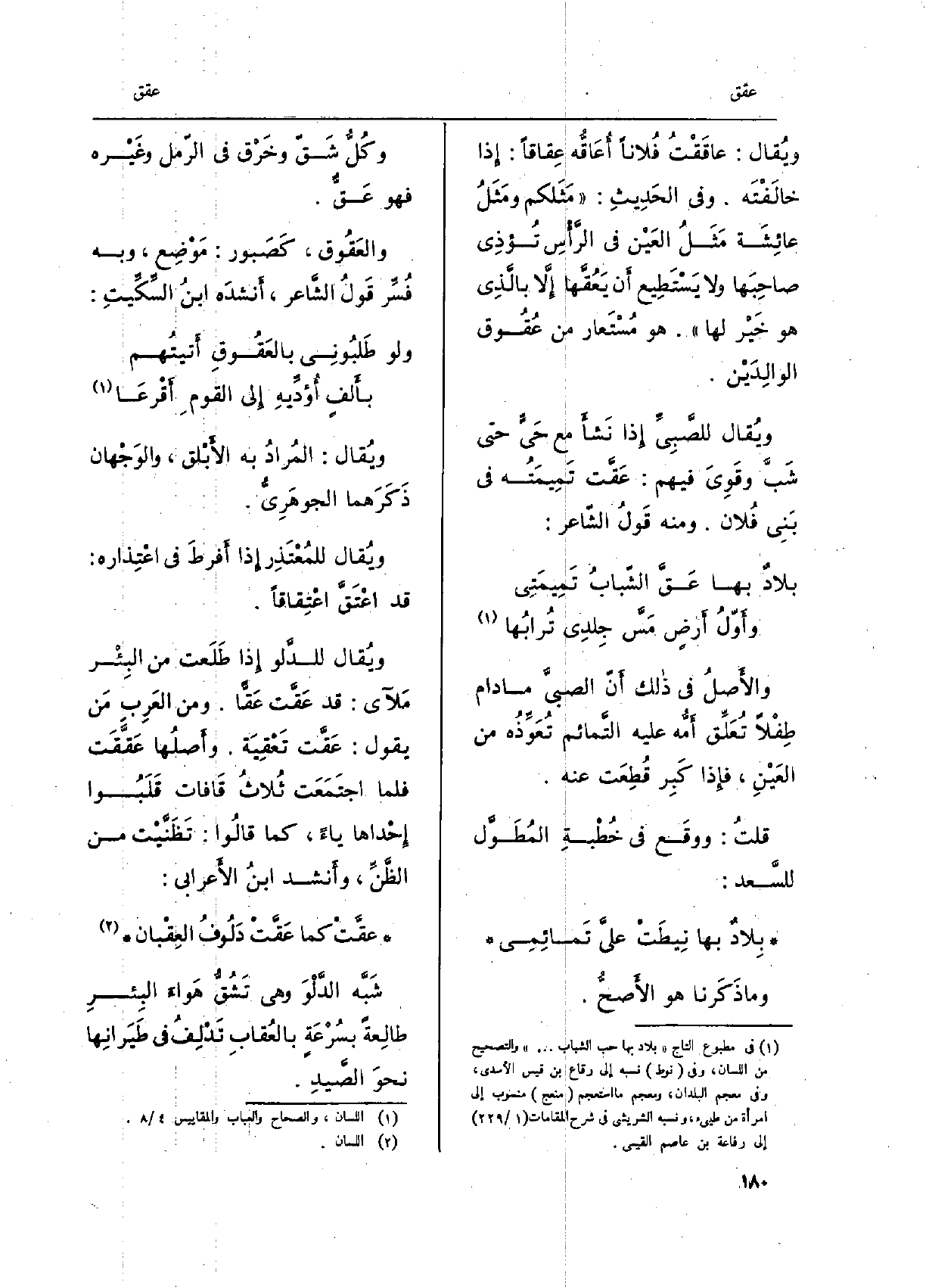 ويُقال: المُرادُ بِهِ الأبْلق، والوَجْهان ذكَرَهما الجوهَريُّ. ويُقال للمُعْتَذِر إِذا أفرطَ فِي اعتِذاره: قد {اعْتَقّ} اعْتِقاقاً. ويُقال للدّلو إِذا طلَعت من البِئْر مَلأى: قد {عقّت} عَقّاً. وَمن العَرِب مَن يَقُول: {عَقّت} تعْقِيَة. وأصلُها عقّقَت فَلَمَّا اجتَمَعت ثُلاثُ قافات قلَبوا إحْداها يَاء، كَمَا قَالُوا: تظَنّيْت من الظَّنِّ، وَأنْشد ابنُ الْأَعرَابِي: عقّتْ كَمَا عقّتْ دَلوفُ العِقْبان شبّه الدّلْوَ وَهِي تَشُقُّ هَواءَ البِئْر طالِعةً بسرعَةٍ بالعُقاب تدْلِف فِي طيَرانِها نحوَ الصَّيد.
