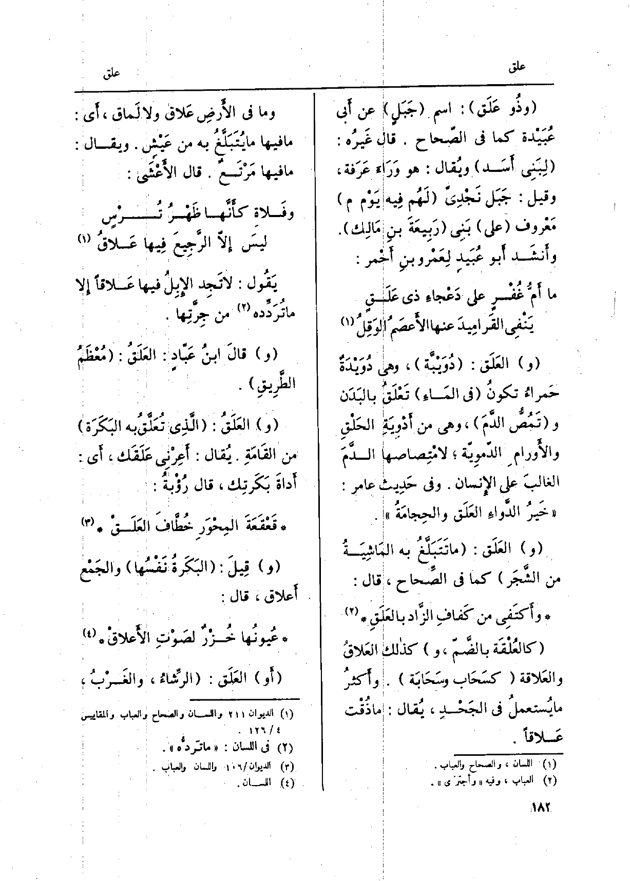 يَقُول: لَا تَجِد الإبلُ فِيهَا عَلاقاً إِلَّا مَا تُردِّده من جِرَّتِها. وَقَالَ ابنُ عبّاد: العلَقُ: معْظَمُ الطّريق.