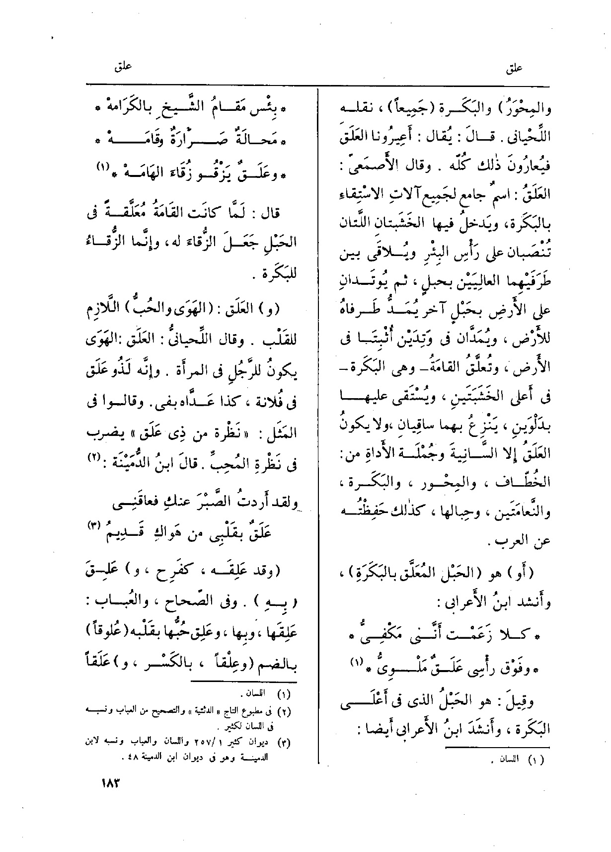 والمِحْوَرُ والبكَرة جَميعاً، نَقله اللّحْياني. قَالَ: يُقال: أعيرُونا العلَق فيُعارونَ ذَلِك كلّه. وَقَالَ الْأَصْمَعِي: العلَقُ: اسمٌ جَامع لجَميع آلاتِ الاسْتِقاء بالبَكَرة، ويدخلُ فِيهَا الخَشبتان اللّتان تُنْصَبان على رأسِ البِئْرِ ويُلاقَى بَين طَرَفيْهِما العالِيَيْن بحبلٍ، ثمَّ يوتَدانِ على الأَرْض بحبْلٍ آخر يُمَدُّ طرفاهُ للأرْض، ويُمَدّان فِي وتِدَيْن أُثْبِتا فِي الأَرْض، وتُعلَّقُ القامَةُ وَهِي البكَرة فِي أَعلَى الخشَبَتين، ويُسْتَقى عَلَيْهَا بدلْوَين، ينزِعُ بهما ساقِيان، وَلَا يكونُ العلَقُ إِلَّا السّانِيةَ وجُملَة الأداةِ من: الخُطّاف، والمِحْور، والبَكَرة، والنّعامَتين، وحِبالها، كَذَلِك حفِظْتُه عَن الْعَرَب. أَو هُوَ الحَبْل المُعلَّق بالبَكرة، وَأنْشد ابنُ الْأَعرَابِي: كلا زَعَمْت أنّني مَكْفيُّ وفوْق رَأْسِي علَقٌ ملْويُّ وَقيل: هُوَ الحبْلُ الَّذِي فِي أعْلى البكَرة، وأنشدَ ابنُ الْأَعرَابِي أَيْضا: بِئْسَ مَقامُ الشّيخِ بالكَرامهْ مَحالَةٌ صَرّارَةٌ وقامَهْ وعلَقٌ يزْقو زُقاءَ الهامَهْ قَالَ: لمّا كَانَت القامَةُ معلَّقةً فِي الحبْلِ جعَلَ الزُّقاءَ لَهُ، وإنّما الزُّقاءُ للبكرة. والعلَق: الهَوَى والحُبُّ اللازِم للقَلْب. وَقَالَ اللِّحيانيُّ: العلَق: الهَوى يكونُ للرّجُلِ فِي الْمَرْأَة. وإنّه لَذو علَق فِي فُلانة، كَذَا عدّاه بفي. وَقَالُوا فِي المثَل: نظْرة من ذِي علَق يضْرب فِي نظْرةِ المُحبِّ. قَالَ ابنُ الدُّمَيْنَة: