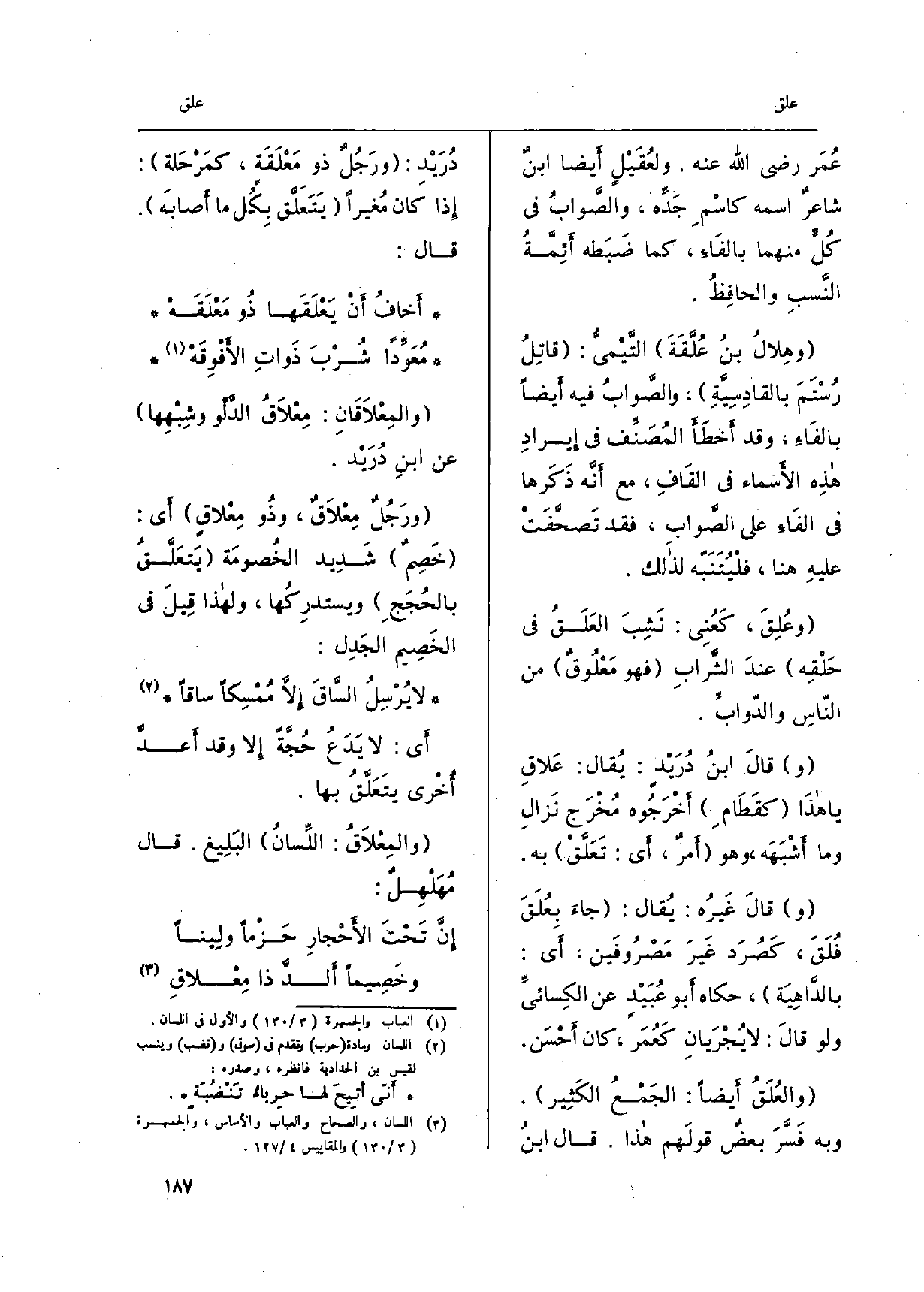 عُمَر رَضِي الله عَنهُ. ولعُقَيْلٍ أَيْضا ابنٌ شاعرٌ اسْمه كاسْمِ جدّه، والصّوابُ فِي كلٍّ مِنْهُمَا بالفاءِ، كَمَا ضبَطه أئِمّةُ النّسبِ والحافِظُ. وهِلالُ بنُ عُلَّقَة التّيْميُّ: قاتِلُ رُسْتَمَ بالقادسيّة، والصّوابُ فِيهِ أَيْضا بالفاءِ، وَقد أخطأَ المُصنِّف فِي إيرادِ هَذِه الأسماءِ فِي القافِ، مَعَ أنّه ذكَرها فِي الفاءِ على الصّواب، فقد تصحّفَتْ عليهِ هُنَا، فليُتَنَبّه لذَلِك. وعُلِق، كعُنِيَ: نشِبَ العلَقُ فِي)