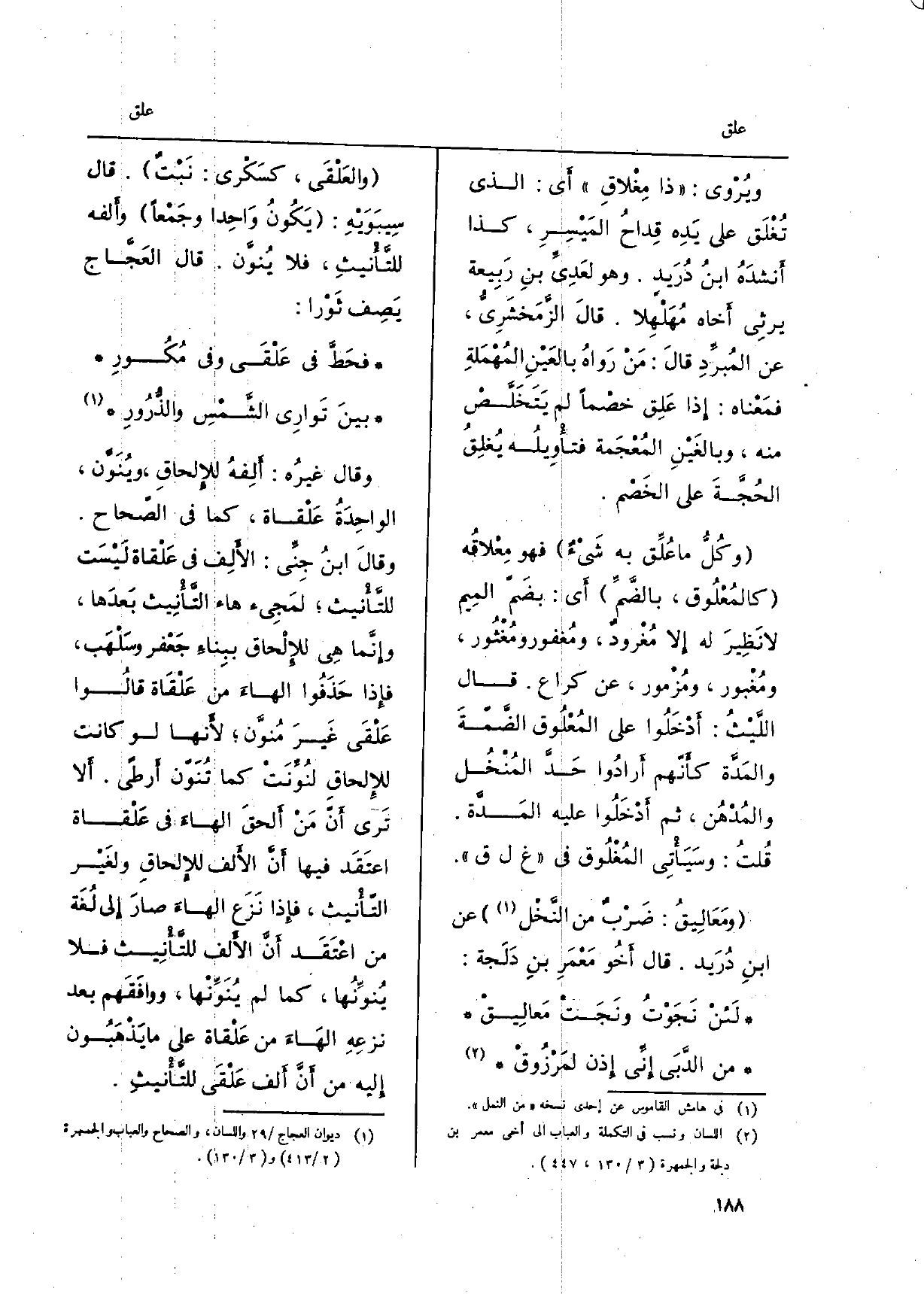 أَلا ترى أَن مَنْ ألحقَ الهاءَ فِي عَلْقاة اعتَقَد فِيهَا أنّ الألفَ للإلحاقِ ولغيْر التّأْنيث، فَإِذا نزَع الهاءَ صارَ الى لُغة من اعْتَقَد أنّ الألفَ للتأْنيث فَلَا ينوِّنُها، كَمَا لم ينوِّنْها، ووافَقَهم بعد نزعِهِ الهاءَ من عَلْقاة على مَا يذْهَبون إِلَيْهِ من أنّ ألف عَلْقَى للتّأنيثِ.