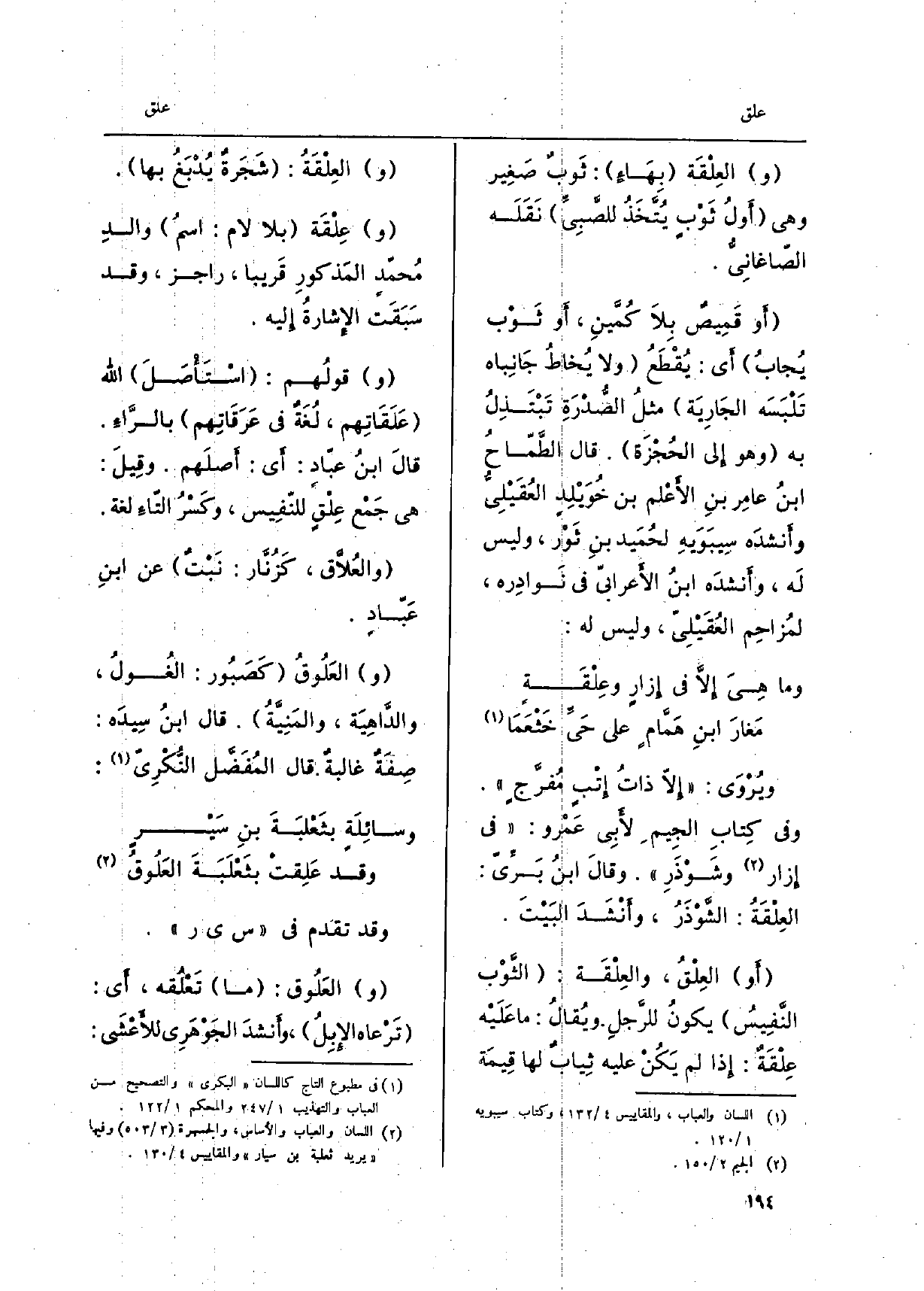 ويُرْوَى: إِلَّا ذاتُ إتْبٍ مُفرَّجٍ. وَفِي كِتاب الْجِيم لأبي عَمْرو: فِي إِزَار وشَوْذَر. وَقَالَ ابنُ بَرّي: العِلْقَة: الشّوْذَرُ، وأنْشَدَ البيتَ. أَو العِلْقُ، والعِلْقَة: الثّوْب النّفيسُ يكون للرّجلِ. ويُقال: مَا عَلَيْه عِلْقَة: إِذا لم يكن عَلَيْهِ ثِيابٌ لَهَا قِيمة والعِلْقَة: شجَرة يُدْبَغُ بهَا. وعِلْقَة بِلَا لَام: اسمُ والدِ محمّد الْمَذْكُور قَرِيبا، راجز، وَقد سبَقَت الإشارةُ إِلَيْهِ. وقولُهم: استأصَل الله علَقاتِهم، لُغةٌ فِي عَرَقاتِهم بالرّاءِ. قَالَ ابنُ عبّادٍ: أَي: أصلَهم. وقيلَ: هِيَ جمْع عِلْقٍ للنّفيس، وكسْرُ التّاءِ لُغَة. والعُلاّق، كزُنّار: نبْتٌ عَن ابنِ عبّاد. والعَلوقُ كصَبُور: الغُولُ، والدّاهِية، والمَنِيّةُ. قَالَ ابنُ سيدَه: صِفة غالبةٌ. قَالَ المفَضَّل النُكْرِيّ: