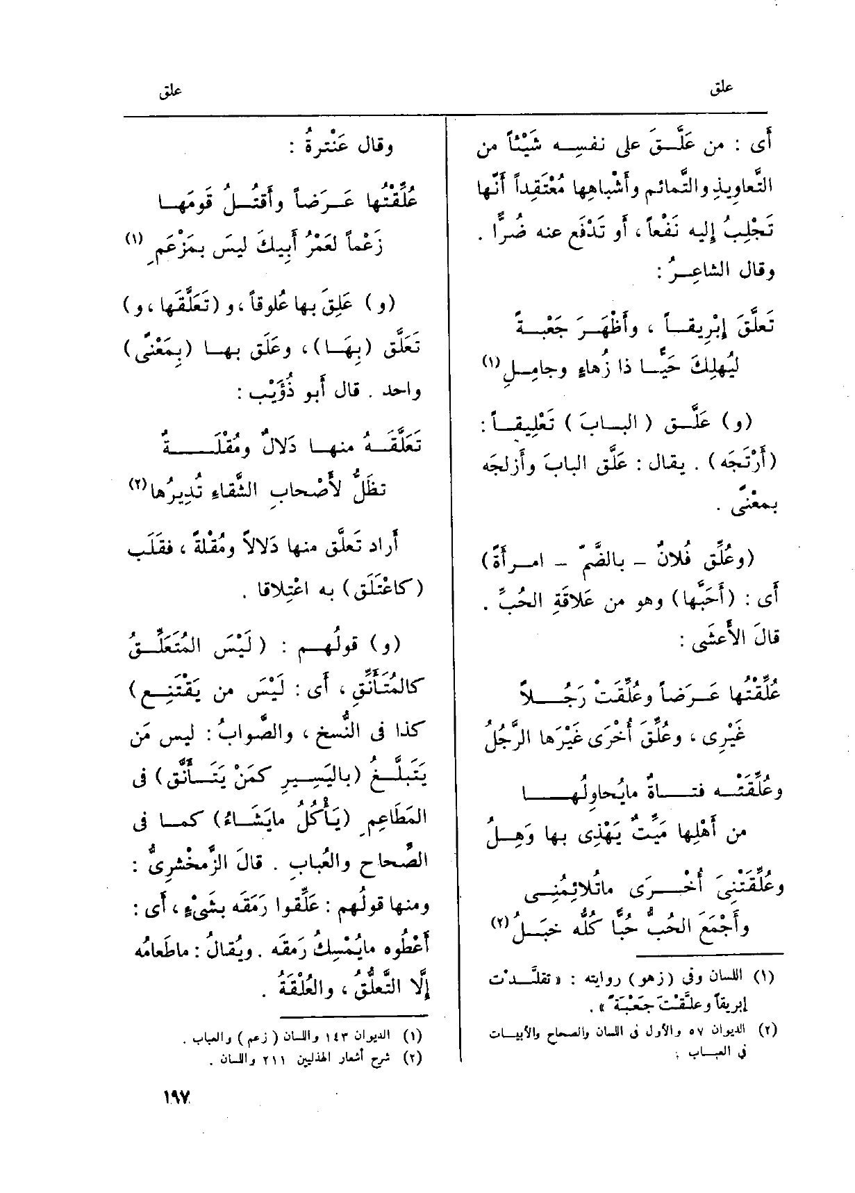 وووعَلِقَ بهَا عُلوقاً، وتعلَّقَها، وتعَلَّق بِها، وعَلَق بهَا بمَعْنىً وَاحِد. قَالَ أَبُو ذؤيْب: