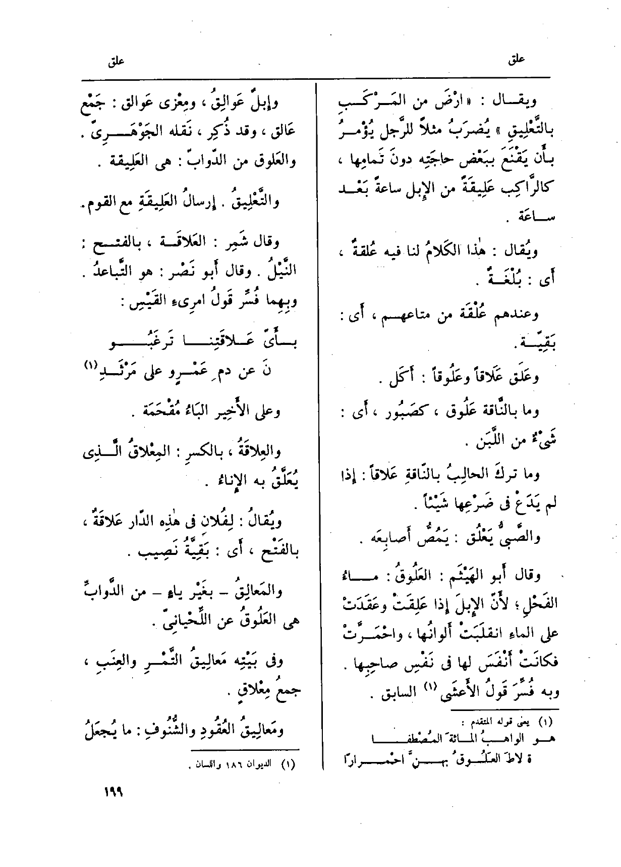 وعَلى الْأَخير الباءُ مُقْحَمَة. والعِلاقَةُ، بِالْكَسْرِ: المِعْلاقُ الَّذِي يُعَلَّقُ بِهِ الإناءُ. ويُقال: لفُان فِي هَذِه الدّار عَلاقَة، بالفَتْح، أَي: بقيّةُ نَصيب. والمَعالِقُ بغيْر ياءٍ من الدّوابِّ هِيَ العَلوقُ عَن اللّحيانيّ. وَفِي بيتِه مَعاليقُ التّمْرِ والعِنَبِ، جمعُ مِعْلاقٍ. ومَعاليقُ العُقودِ والشُّنوفِ: مَا يُجعَلُ