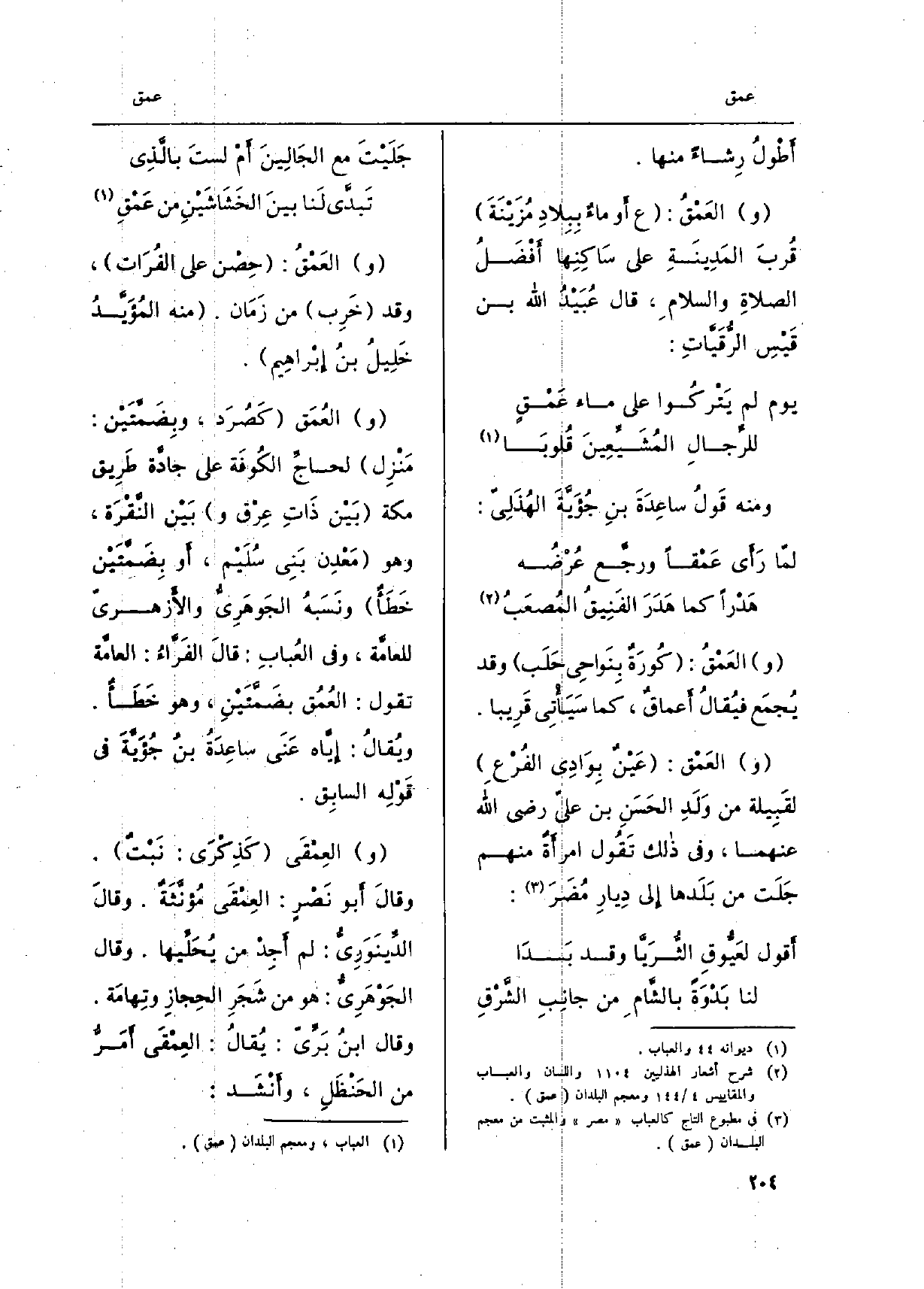 أطولُ رِشاءً مِنْهَا. والعَمْقُ: ع أَو ماءٌ ببلادِ مُزَيْنَة قُربَ المَدينَة على ساكنِها أفضَلُ الصلاةِ وَالسَّلَام، قَالَ عُبَيدُ الله بن قيْس الرُّقَيّات: