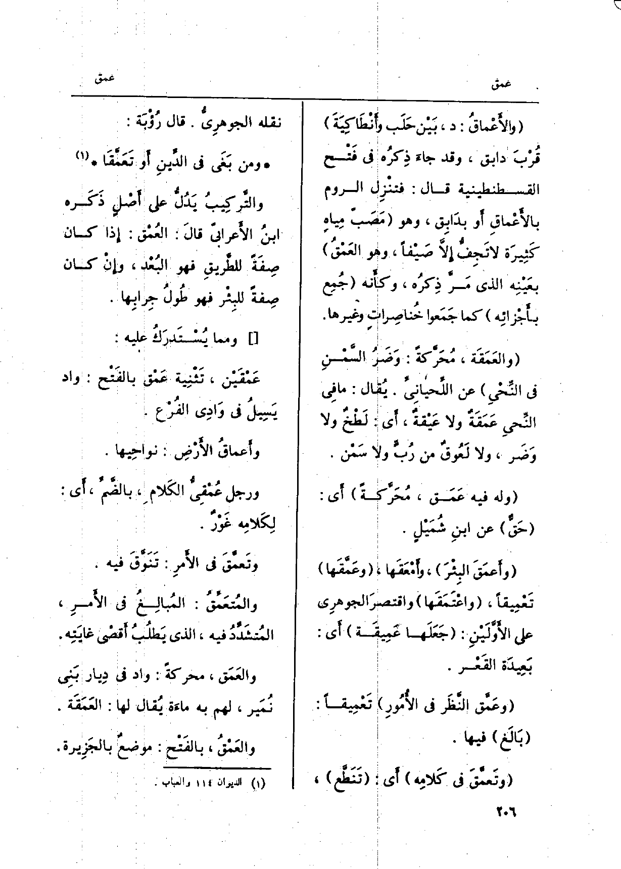 وعمَّق النّظَر فِي الأمورِ تعْميقاً: بالَغ فِيهَا. وتعمَّقَ فِي كلامِه أَي: تنطّع، نَقله الجوهريُّ. قَالَ رؤبة: وَمن بَغَى فِي الدّينِ أَو تعمَّقا والتّركيبُ يدُلُّ على أصْلٍ ذكَره ابنُ الأعرابيّ قَالَ: العُمْق: إِذا كَانَ صِفَةً للطّريقِ فَهُوَ البُعْد، وإنْ كَانَ صِفَةً للبِئْرِ فَهُوَ طُولُ جِرابِها. وَمِمَّا يُستدرَكُ عَلَيْهِ: عمْقَيْن، تثْنِية عمْق بالفَتْح: وَاد يسيلُ فِي وَادي الفُرْع. وأعماقُ الأرْضِ: نواحِيها. وَرجل عُمْقِيُّ الكَلامِ، بالضّمِّ، أَي: لكَلامِه غَوْر. وتعمَّقَ فِي الْأَمر: تنَوَّق فِيهِ. والمُتعمِّقُ: المُبالِغ فِي الأمرِ، المتشدِّدُ فِيهِ، الَّذِي يطلُبُ أقْصَى غايَته. والعَمَق، محركةً: وَاد فِي دِيار بَني نُمَير، لَهُم بِهِ ماءَة يُقال لَهَا: العَمَقة. والعَمْقُ، بالفَتْح: موضعٌ بالجَزيرة.