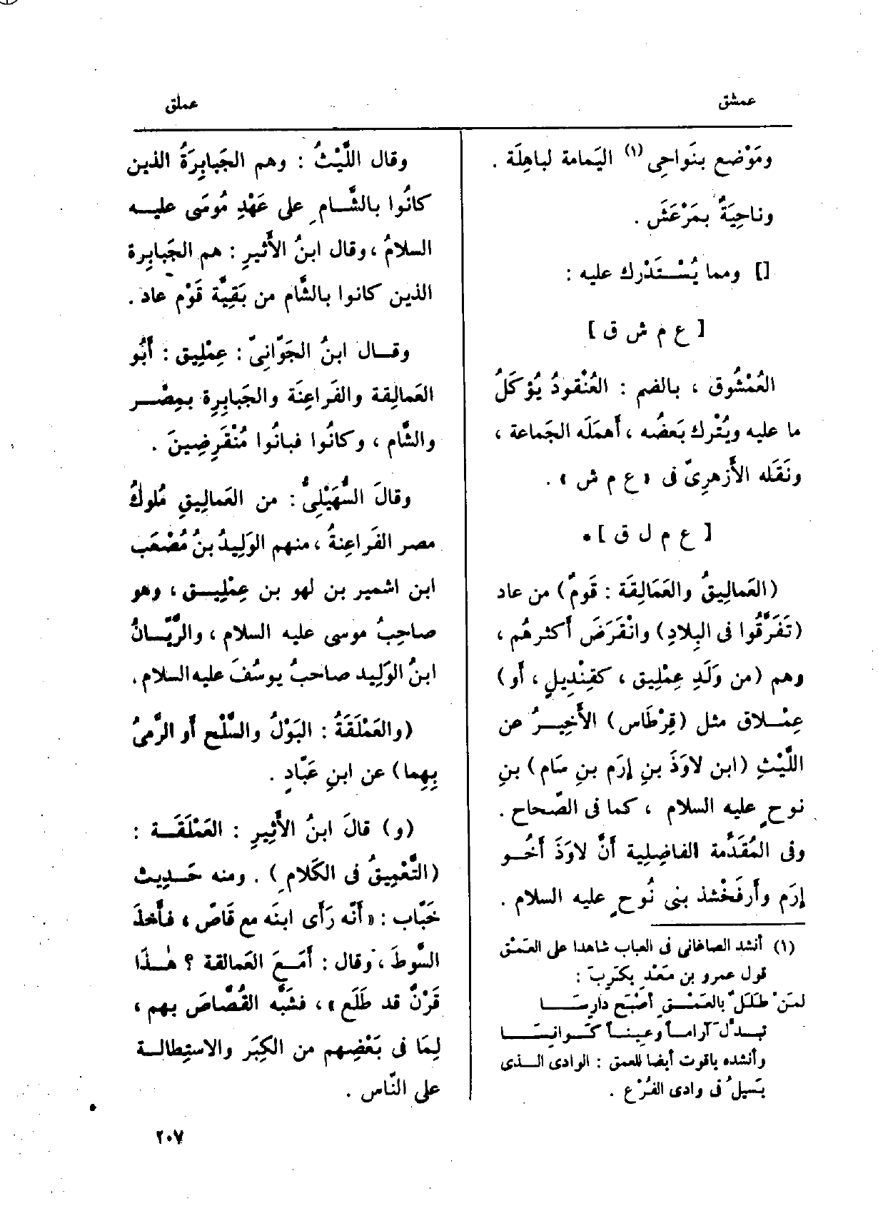 العَمالِيقُ، والعَمالِقَة: قومٌ من عَاد تفرّقوا فِي البِلادِ وانْقَرَض أكثرهُم، وهم من ولَدِ عِمْلِيق، كقِنْديل، أَو عِمْلاق مثل قِرْطاس الأخيرُ عَن اللّيْثِ ابْن لاوَذَ بنِ إرَم بنِ سَام بنِ نوحٍ عَلَيْهِ السَّلَام، كَمَا فِي الصّحاح. وَفِي المقدِّمة الفاضِلِية أنّ لاوَذَ أَخُو إرَم وأرفَخْشذ بني نُوح عَلَيْهِ السَّلَام. وَقَالَ اللّيْثُ: وهم الجَبابِرَةُ الَّذين كَانُوا بالشّام على عهْدِ موسَى عَلَيْهِ السلامُ، وَقَالَ ابنُ الْأَثِير: هم الجَبابِرَة الَّذين كَانُوا بالشّام من بقيّة قوْم عَاد. وَقَالَ ابنُ الجَوّانيّ: عِمْليق: أَبُو العَمالِقَة والفَراعِنَة والجَبابِرة بمِصْر والشّام، وَكَانُوا فبانُوا مُنْقَرِضين. وَقَالَ السُّهَيْليُّ: من العَماليقِ مُلوكُ مصر الفَراعِنةُ، مِنْهُم الوَليدُ بنُ مُصْعَب بن اشمير بن لَهو بن عِمْليق، وَهُوَ صاحِبُ مُوسَى عَلَيْهِ السَّلَام، والرّيّانُ بنُ الوَليد صاحبُ يوسُفَ عَلَيْهِ السَّلَام. والعَمْلَقَةُ: البوْلُ والسّلْح أَو الرّميُ بهِما عَن ابنِ عبّاد. وَقَالَ ابنُ الْأَثِير: العَمْلَقَة: التّعْميقُ فِي الكَلام. وَمِنْه حَديث خبّاب: أنّه رأى ابنَه مَعَ قاصّ، فأخذَ السّوطَ، وَقَالَ: أمَعَ العَمالِقَة هَذَا قرْنٌ قد طلع، فشَبَّه القُصّاصَ بهم، لِما فِي بعْضِهم من الكِبَر والاستِطالة على النّاس.