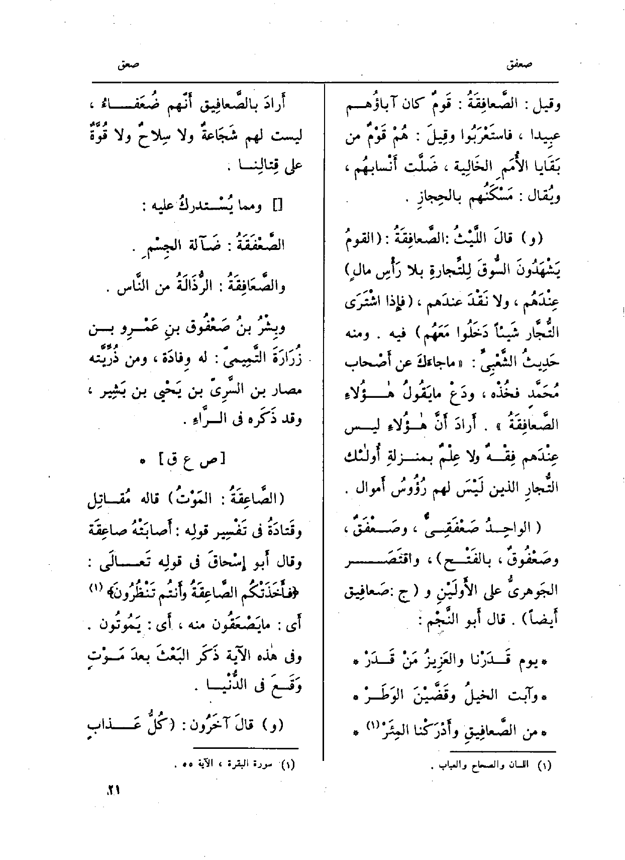 ْ مَا يَقولُ هؤلاءِ الصّعافِقَةُ. أرادَ أنّ هؤلاءِ لَيْسَ عندَهم فِقْهٌ وَلَا عِلْمٌ بمنزلةِ أُولَئِكَ التُجارِ الَّذين ليسَ لَهُم رؤوسُ أَمْوَال. الواحِدُ صَعْفَقيُّ، وصَعْفَقٌ، وصَعْفوقٌ، بالفَتْح، واقتَصَر الجوهريُّ على الأولَيْنِ وَج: صَعافيق أَيْضا. قَالَ أَبُو النّجم: يَوْم قَدَرْنا والعَزيزُ مَنْ قَدَرْ وآبَت الخيلُ وقضّيْنَ الوَطَرْ من الصّعافِيقِ وأدْرَكْنا المِئَرْ أرادَ بالصّعافيق أنّهم ضُعَفاءُ، لَيست لَهُم شضجاعةٌ وَلَا سِلاحٌ وَلَا قوّةٌ على قِتالِنا. وَمِمَّا يُسْتدركُ عَلَيْهِ: الصّعْفَقَةُ: ضَآلةُ الجِسْمِ. والصّعافقَة: الرُّذالَةُ من النّاس. وبِشْرُ بنُ صَعْفوق بنِ عمْرِو بن زُرارَةَ التّمِيميّ: لَهُ وِفادَة، وَمن ذُرِّيَّته مصار بن السّرِيّ بن يَحْيى بن بَشير، وَقد ذكَره فِي الرّاءِ.