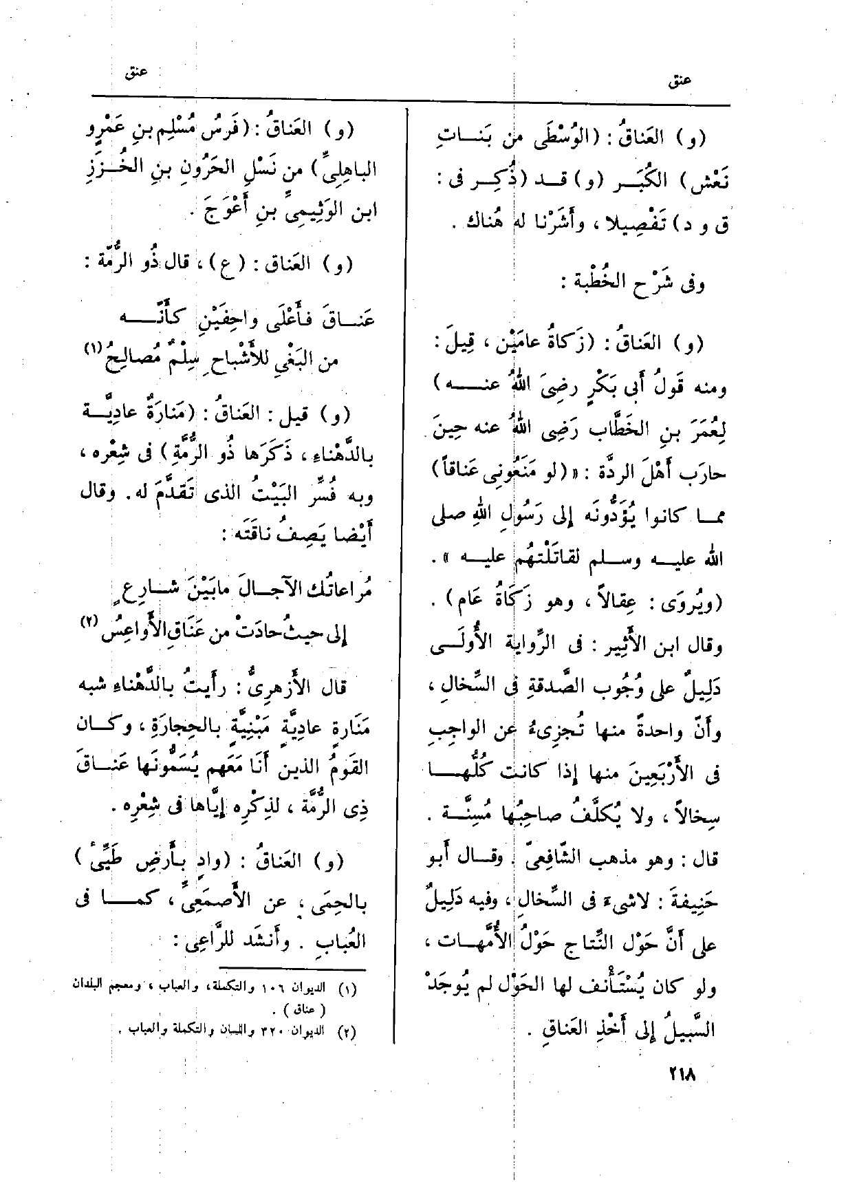 قَالَ الأزهريُّ: رأيتُ بالدّهْناءِ شبه مَنارةٍ عاديّةٍ مبْنيّةٍ بالحِجارَة، وَكَانَ القومُ الَّذين أَنا معَهم يُسمّونَها عَناقَ ذِي الرُّمّة، لذِكْرِه إيّاها فِي شِعْرِه. والعَناقُ: وادٍ بأرضِ طَيئ بالحِمَى، عَن الْأَصْمَعِي، كَمَا فِي العُباب. وَأنْشد للرّاعي:)