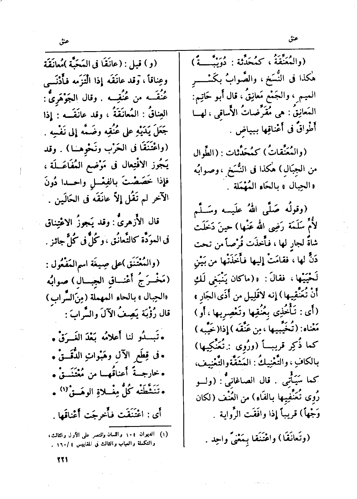 والمُعَنَّقَةُ، كمُحَدِّثة: دُوَيْبّةٌ هَكَذَا فِي النُسخ، والصّوابُ بكسْرِ الْمِيم، والجَمْع مَعانِقُ، قَالَ أَبُو حاتِم: المَعانِقُ: هِيَ مُقَرِّضاتُ الأساقي، لَهَا أطْواقٌ فِي أعناقِها ببياض. والمُعَنَّقاتُ كمُحَدِّثات: الطِّوال من الجِبال هَكَذَا فِي النُسَخ، وصوابُه الحِبال بالحاءِ المُهْمَلَة. وقولُه صلّى اللهُ علَيه وسلّم لأمِّ سَلَمة رضِي الله عنْها حينَ دخَلَت شاةٌ لجارٍ لَهَا، فأخذَت قُرْصاً من تَحت دنٍّ لَهَا، فقامَت إِلَيْهَا فأخذَتْها من بيْن لَحْيَيْها، فَقَالَ: مَا كَانَ ينْبَغي لكِ أَن تُعَنّقِيها إِنَّه لَا قَليل من أذَى الجارِ أَي: تأخُذي بعُنُقِها وتَعْصِرِيها، أَو معْناه: تُخَيِّبيها، من عَنَّقَه إِذا خيّبه كَمَا ذُكِر قَرِيبا ورُوِي: تُعَنِّكيها بالكافِ، والتِّعْنيكُ: المَشَقّة والتّعْنيف، كَمَا سَيَأْتِي. قَالَ الصاغانيّ: وَلَو رُوِي تُعَنّفيها بِالْفَاءِ من العُنْف لَكَانَ وَجْهاً قَرِيبا إِذا وافَقَت الرّواية. وتَعانَقا واعْتَنَقا بمَعْنىً واحِد. وَقيل: عانَقا فِي المحبّة مُعانَقَة وعِناقاً، وَقد عانَقَه إِذا الْتَزَمه فأدْنَى عُنُقَه من عُنُقِه. وَقَالَ الجوهَريّ: العِناقُ: المُعانَقَةُ، وَقد عانَقَه: إِذا جعَل يدَيْه على عُنُقِه وضمّه الى نفْسِه. واعْتَنَقا فِي الحَرْب ونَحْوِها. وَقد يجوز الافْتِعال فِي موْضع المُفاعَلَة، فَإِذا خَصَصْتَ بالفِعْل وَاحِدًا دون الآخر لم تَقُل إلاّ عانَقَه فِي الحالَين. قَالَ الأزهريُّ: وَقد يَجوزُ الاعْتِناق فِي المودّة كالتَّعانُق، وكُلٌّ فِي كُلٍّ جَائِز. والمُعْتَنَق على صيغَة اسْم الْمَفْعُول: مَخْرَجُ أعْناقِ الجِبالِ صوابُه الحِبال بالحاءِ المُهملة منَ السّرابِ قَالَ رؤبَة يصِفُ الآلَ والسّراب: تبدو لنا أعلامُه بعْدَ الغَرَقْ فِي قِطَعِ الآلِ وهَبْواتِ الدُّقَقْ خَارِجَة أعناقُها من مُعْتَنَقْ تنشّطَتْه كُلُّ مِغْلاةِ الوهَقْ أَي: اعْتَنَقَت فأخرجَت أعْناقَها.