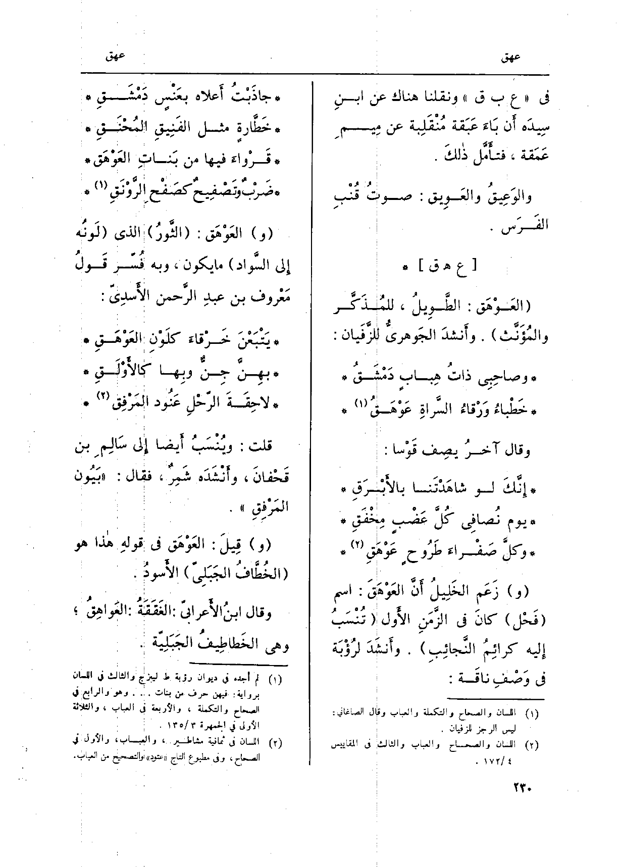 العَوْهَق: الطّويلُ: للمذكَّر والمؤنّث. وأنشدَ الجوهريّ للزَّفَيان: وصاحِبي ذاتُ هِبابٍ دَمْشَقُ خَطْباءُ وَرْقاءُ السّراةِ عوْهَقُ وَقَالَ آخرُ يصِف قوْساً: إنّكَ لَو شاهَدْتَنا بالأبْرَقِ يَوْم نُصافِي كُلَّ عضْبٍ مِخْفَقِ وكلَّ صَفْراءَ طَروحٍ عوْهَقِ وزَعَم الخَليلُ أنّ العَوْهَقَ: اسْم فحْل كَانَ فِي الزّمنِ الأول تُنسَبُ إِلَيْهِ كرائِمُ النّجائِب. وَأنْشد لرؤْبَة فِي وصْفِ ناقَة: جاذَبْتُ أَعْلَاهُ بعَنْسٍ دَمْشَقِ خطّارةٍ مثل الفَنيقِ المُحْنَقِ قَرْواءَ فِيهَا من بناتِ العوْهَقِ ضرْبٌ وتصْفيحٌ كصَفْحِ الرّونَقِ والعَوْهَق: الثّورُ الَّذِي لونُ الى السّواد مَا يكون، وَبِه فُسّر قولُ معْروف بن عبدِ الرّحمن الأسديّ: يتْبَعْنَ خرْقاءَ كلَوْنِ العَوْهَقِ بهِنّ جِنٌّ وَبهَا كالأوْلَقِ لاحِقَةَ الرّحْلِ عَنود المَرْفِق قلت: ويُنْسَبُ أَيْضا الى سالِمِ بنث قحْفان، وأنْشَدَه شَمِرٌ، فَقَالَ: بَيون المَرْفِقِ. وَقيل: العَوْهَق فِي قولَه هَذَا هُوَ الخُطّافُ الجَبَليّ الأسودُ. وَقَالَ ابنُ الْأَعرَابِي: الغَقَقَة: العَواهِقُ وَهِي الخَطاطيفُ الجبليّة.