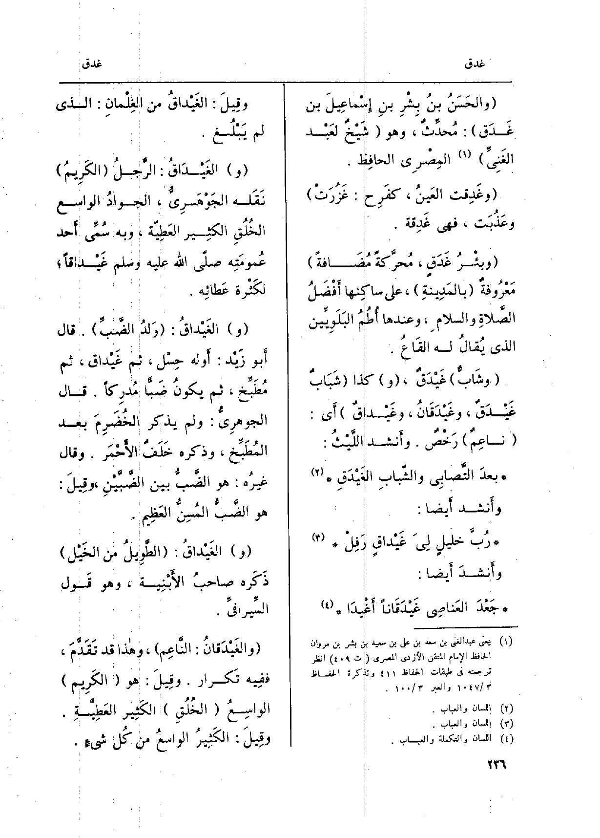 والحَسَنُ بنُ بِشْرِ بنِ إسْماعِيلَ بن غَدَق: مُحدِّثٌ، وَهُوَ شيخٌ لعَبْد الغَنيّ المِصْري الحافِظ. وغَدِقت العَينُ، كفَرِح: غَزُرَتْ وعَذُبَت، فَهِيَ غَدِقة. وبئْرُ غَدَقٍ، مُحرَّكةً مُضافةً مَعْروفةٌ بالمَدينةِ، على ساكنِها أفضَلُ الصّلاةِ والسّلامِ، وَعِنْدهَا أُطُمُ البَلَويّين الَّذِي يُقَال لَهُ القاعُ. وشابٌّ غَيْدَقٌ، وَكَذَا شَبابٌ غيْدَقٌ، وغَيْدَقانُ، وغَيْداقٌ أَي: ناعِمٌ رَخْصٌ. وَأنْشد اللّيْثُ: بعدَ التّصابي والشّبابِ الغَيْدَقِ وَأنْشد أَيْضا: رُبّ خليلٍ ليَ غيْداقٍ رَفِلْ وَأنْشد أَيْضا: جعْدَ العَناصِي غيْدَقاناً أغْيَدا وقيلَ: الغَيْداقُ من الغِلْمانِ: الَّذِي لم يَبْلُغ. والغَيْداقُ: الرّجُل الكَريمُ نقَله الجوهَريُّ، الجوادُ الواسعُ الخُلُق الْكثير العَطيّة، وَبِه سُمّي أحد عُمومَتِه صلّى الله عَلَيْهِ وَسلم غَيْداقاً لكَثْرَة عَطائِه.