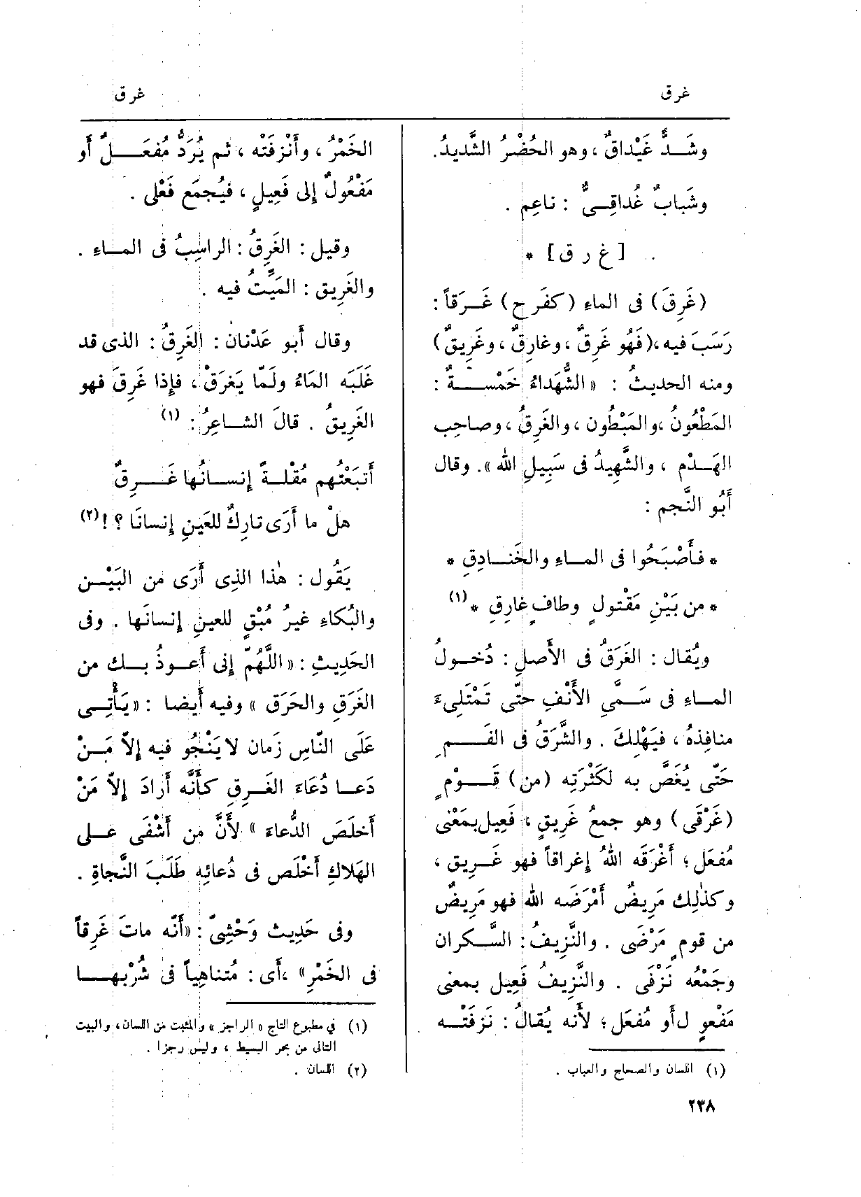 غَرِقَ فِي الماءِ كفَرح غَرَقاً: رَسَبَ فِيهِ، فهُو غَرِقٌ، وغارِقٌ، وغَريقٌ وَمِنْه الحَدِيث: الشُهَداءُ خَمْسةٌ: المَطْعونُ، والمَبْطون، والغَرِقُ، وصاحِب الهَدْم، والشّهيد فِي سَبيل الله. وَقَالَ أَبُو النّجْم: فأصْبَحوا فِي الماءِ والخَنادِقِ من بيْنِ مقْتولٍ وطافٍ غارِقِ ويُقال: الغَرَقُ فِي الأصلِ: دُخولُ الماءِ فِي سمّي الأنْفِ حَتَّى تمْتَلئَ منافِذهُ، فيَهْلِكَ. والشّرَقُ فِي الفَم حتّى يُغَصَّ بِهِ لكثْرَتِه من قوْمٍ غَرْقَى وَهُوَ جمْعُ غَريقٍ، فَعيل بمَعْنى مُفعَل أغْرَقَه اللهُ إغراقاً فَهُوَ غَريق، وكذلِك مَريضٌ أمْرَضَه الله فَهُوَ مَريضٌ من قومٍ مَرْضَى. والنّزيفُ: السّكران وجَمْعُه نَزْفَى. والنّزيفُ فَعيل بِمَعْنى مَفعول أَو مُفعَل لِأَنَّهُ يُقال: نزفَتْه الخَمْرُ، وأنْزفَتْه، ثمَّ يُرَدُّ مُفعَلٌ أَو مَفْعولٌ الى فَعيلٍ، فيُجمَع فَعْلى. وَقيل: الغَرِقُ: الراسبُ فِي الماءِ.