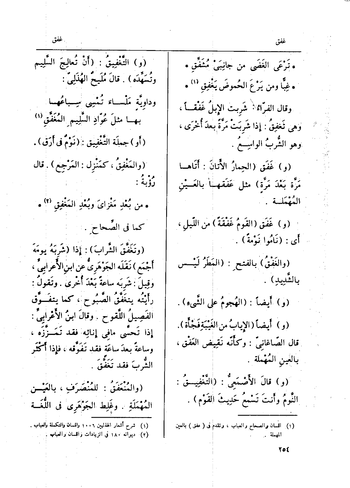تَرْعَى الغَضَى من جانِبَيْ مُشَفِّقِ غِبّاً وَمن يرْعَ الحُموضَ يغْفِقِ قَالَ الفرّاءُ: شرِبت الإبلُ غَفْقاً، وَهِي تغْفِقُ: إِذا شرِبَتْ مرّةً بعدَ أخْرى، وَهُوَ الشُرْبُ الواسعُ.