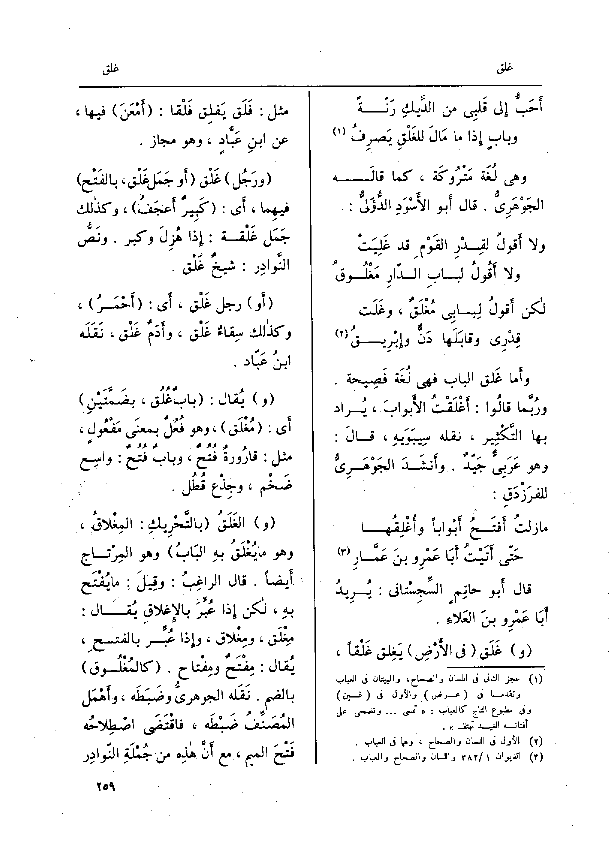 وَأما غلق الْبَاب فَهِيَ لُغَة فَصيحة. وربّما قَالُوا: أغْلَقْتُ الأبوابَ، يُراد بهَا التّكثير، نَقله سيبَوَيه، قَالَ: وَهُوَ عرَبيٌّ جيّدٌ. وأنشَدَ الجوْهَريُّ للفَرزدق: