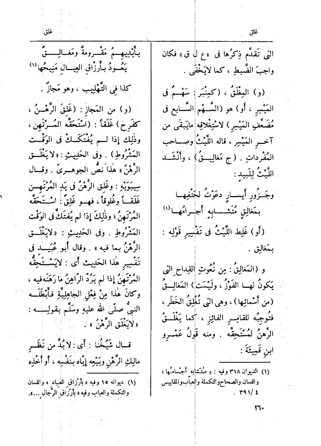 الَّتِي تقدّم ذكرُها فِي ع ل ق فَكَانَ واجبَ الضّبطِ، كَمَا لَا يَخْفَى. والمِغْلَقُ، كمِنْبَر: سهْمٌ فِي المَيْسِر، أَو هُوَ السّهْمُ السّابع فِي مُضَعَّفِ الميْسِر لاستِغْلاقِه مَا يَبقَى من آخِر الميْسِر، قَالَه اللّيثُ وَصَاحب المُفردات. ج مَغاليقُ، وأنْشَد اللّيْثُ للَبيد: