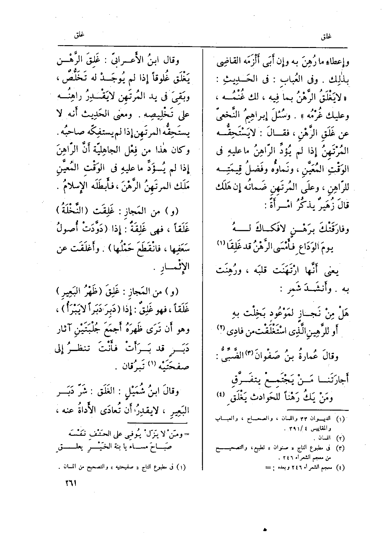 وَقَالَ ابنُ الأعرابيّ: غَلِقَ الرّهْن يغْلَق غُلوقاً إِذا لم يوجَدْ لَهُ تخَلُّصٌ، وبَقِي فِي يدِ المُرتَهِن لَا يَقْدِرُ راهِنُه على تخْليصِه. وَمعنى الحَدِيث أنّه لَا يستَحِقُّه المرتَهِن إِذا لم يستفِكّه صاحبُه. وَكَانَ هَذَا من فِعْل الجاهِليّة أنّ الراهِنَ إِذا لم يؤَدِّ مَا عليهِ فِي الوقْتِ المُعيَّنِ مَلَك المرتَهِنُ الرّهْنَ، فأبطَلَه الإسلامُ. وَمن المَجاز: غلِقَت النّخلَةُ غلَقاً، فَهِيَ غلِقَةٌ: إِذا دوّدَتْ أُصولُ سَعَفِها، فانْقَطَع حمْلُها. وأغلَقَت عَن الإثْمار. وَمن المَجاز: غلِقَ ظَهْرُ البَعير غَلَقاً، فَهُوَ غَلِقٌ: إِذا دبِرَ دَبَراً لَا يَبْرأُ، وَهُوَ أَن تَرى ظهرَهُ أجمَعَ جُلْبَتَيْنِ آثَار دَبَرٍ قد بَرَأَتْ فأنْتَ تنظرُ الى صفحَتَيْه تبرُقان.