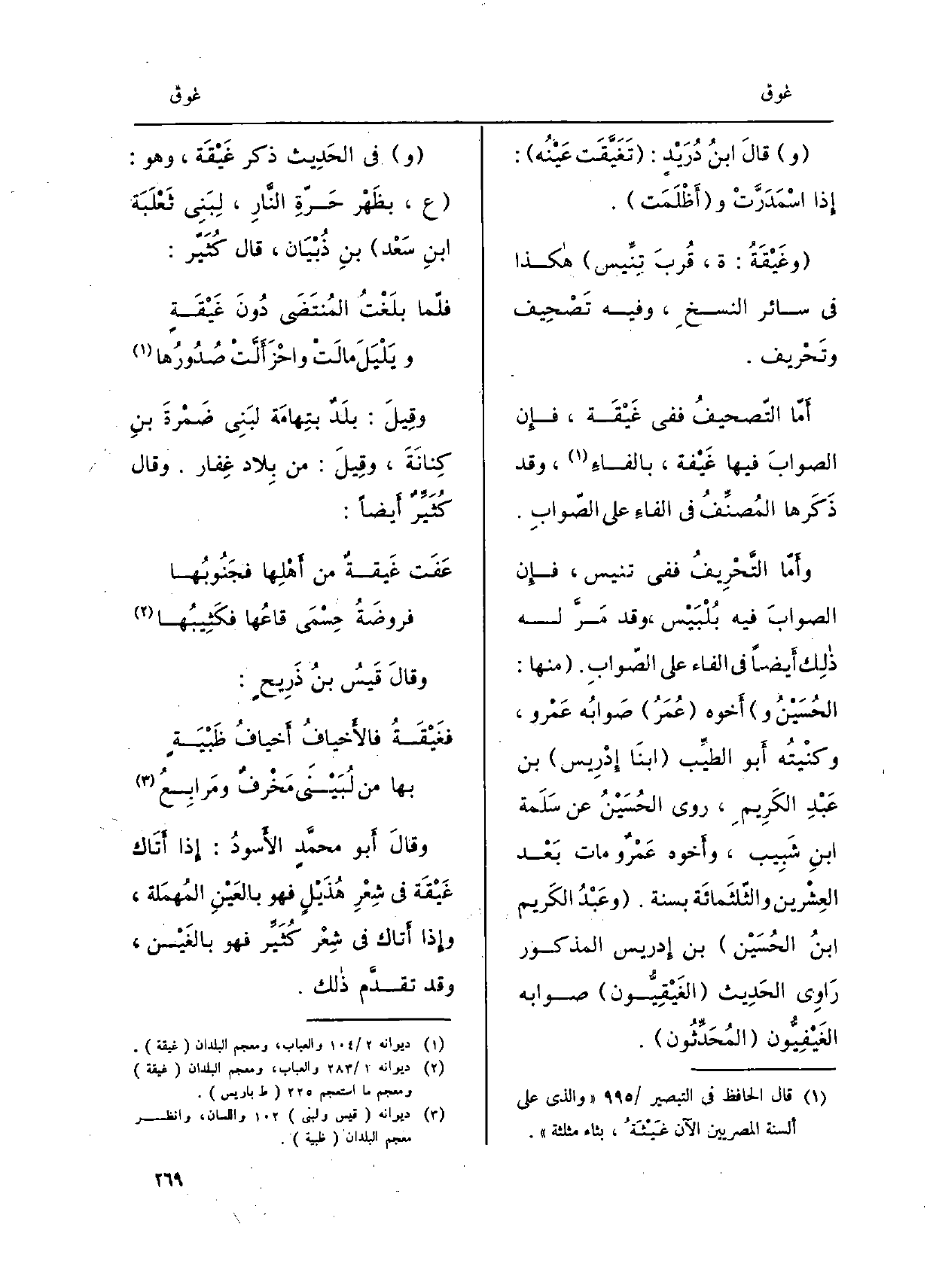 الحُسَيْن عَن سَلَمة بنِ شَبيب، وَأَخُوهُ عَمْرو مَاتَ بعْدَ العِشْرين والثّلثَمائَة بِسنة. وعبْدُ الكَريم بنُ الحُسَيْن بن إِدْرِيس الْمَذْكُور رَاوي الحَديث} الغَيْقِيّون صَوَابه الغَيْقِيّون المُحَدِّثون. وَفِي الحَديث ذكر {غَيْقَة، وَهُوَ: ع، بظَهْر حَرّةِ النّار، لبَنى ثَعْلَبَة بنِ سَعْد بنِ ذُبْيان، قَالَ كُثَيِّر: