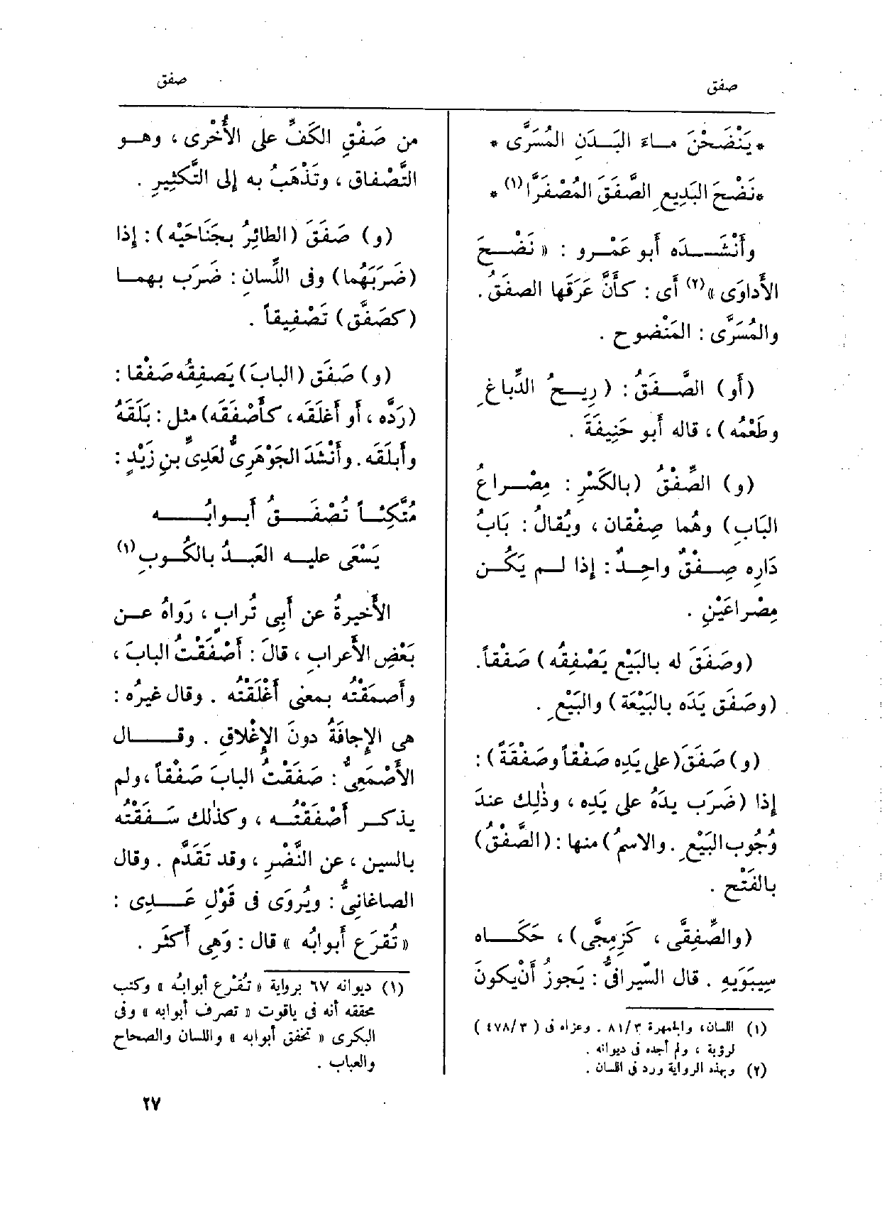 الأخيرةُ عَن أبي تُراب، رَواه عَن بعضِ الأعرابِ، قَالَ: أصْفَقْتُ البابَ، وأصمَقْتُه بِمَعْنى أغْلقْتُه. وَقَالَ غيرُه: هِيَ الإجافَةُ دون الإغْلاقِ. وَقَالَ الأصْمَعي: صَفَقْتُ البابَ صَفْقاً، وَلم يذكر أصْفَقْتُه، وَكَذَلِكَ سَفَقْتُه بِالسِّين، عَن النَّضْرِ، وَقد تقدّم. وَقَالَ الصاغانيّ: ويُروَى فِي قولِ عَدي: تُقرَع أبوابُه قَالَ: وهيَ أكثَر. وَقَالَ أَبُو الدُّقَيْش: صَفَقَ البابَ صَفْقاً: فتَحه قَالَ: وترَكْتُ بابَه مَصْفوقاً: أَي مفْتوحاً. قَالَ: والناسُ يَقُولُونَ: صَفَقْتُ البابَ وأصْفَقْتُه، أَي: ردَدْتُه. وَقَالَ أَبُو الخطّاب: يُقَال: هَذَا كُلّه فهُو ضِدٌّ. وَفِي الصِّحاح: صَفَقَ عيْنَه أَي: ردّها وغمّضها. قَالَ: وصَفَق العودَ صَفْقاً: إِذا حرّكَ أوْتارَه فاصْطَفَق. وصفَقَ الرّجُلُ صَفْقاً: ذهَب. وصَفَقَت الريحُ الأشْجارَ صَفْقاً: هزّتْها وحرّكتْها فاصْطَفَقَت، نَقله الجوهريّ. وصَفَق القدَحَ صَفْقاً: ملأَه قَالَه الفرّاءُ كأصْفَقَه قَالَه اللِّحْيانيُّ. وَقَالَ ابنُ درَيد: صَفَقتْ علينا صافِقَةٌ من النّاس: أَي نزَل بِنَا جَماعةٌ. قَالَ: وصَفَقت النّاقَة صَفْقاً: إِذا أُرْتِجَتْ رحِمُها عَن ولَدِه حتّى يموتَ الولَدُ. وصَفَق فُلاناً بالسّيفِ صَفْقاً: ضرَبَه بِهِ، قَالَه ابنُ شُمَيل، وَكَذَا صَفَق رأسَه، وعينَه، وصَفَق بِهِ الأرضَ، كَمَا فِي الأساس. ويُقال: ربِحَتْ صَفْقَتُك للمُشْتَري، وصَفْقَةٌ رابِحة، أَو صَفْقةٌ خاسِرةٌ أَي: بَيْعَة. وَفِي حَديثِ ابنِ مسعودٍ: صَفْقَتانِ فِي صَفْقَةٍ رِباً أرادَ بيْعَتانِ فِي بَيْعَة، وَهُوَ على وَجْهَيْن: أحدُهما: أَن يَقول البائِعُ للمُشْتَري: بعتُك عَبْدي