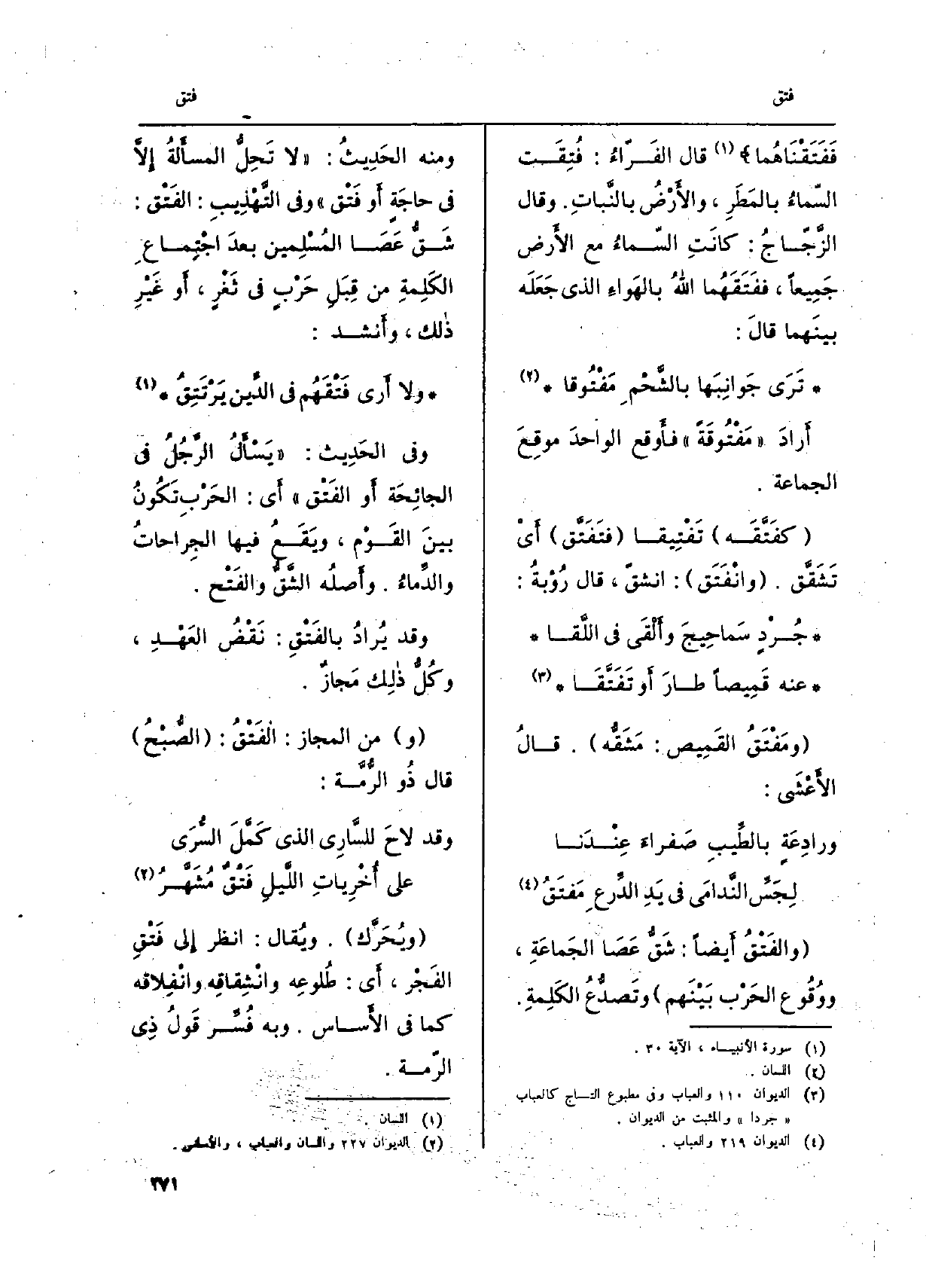 ففَتَقْناهُما (قَالَ الفَرّاءُ: فُتِقَت السّماءُ بالمَطَرِ، والأرضُ بالنّباتِ. وَقَالَ الزّجّاجُ: كانَتِ السّماءُ مَعَ الأَرْض جَمِيعًا، ففَتَقَهُما اللهُ بالهَواءِ الَّذِي جعَلَه بينَهما قَالَ: تَرى جوانِبَها بالشّحْمِ مَفْتوقا أرادَ مفْتوقَةً فأوقَع الواحدَ موقِعَ الْجَمَاعَة. كفتّقَه تفْتيقاً فتفتّق أيْ تشقّق. وانْفَتَق: انشقّ، قَالَ رؤبَة: جُرْدٍ سَماحيجَ وألْقَى فِي اللَّقا عَنهُ قَميصاً طارَ أَو تفتَّقا ومَفْتَقُ القَميص: مَشَقُّه. قَالَ الأعْشى: