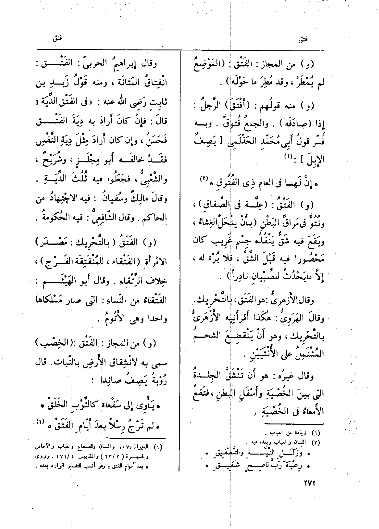 وَمن الْمجَاز: الفَتْق: الموضِعُ لم يُمْطَرْ، وَقد مُطِر مَا حوْلَه. وَمِنْه قولُهم: أفْتَقَ الرّجُل: إِذا صادَفَه. وَالْجمع فُتوق. وَبِه فُسّر قولُ أبي محمّدِ الحَذْلَمي يصِفُ الإبلَ: إنّ لَها فِي الْعَام ذِي الفُتوقِ)