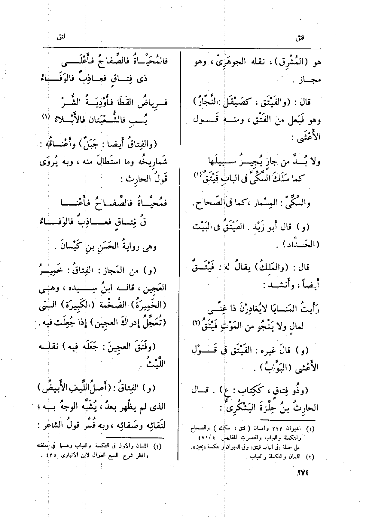 وَقَالَ غَيره: الفَيْتَق فِي قوْل الْأَعْشَى البَوّاب. وَذُو فِتاقٍ، ككِتاب: ع. قَالَ الحارِثُ بنُ حِلِّزةَ اليَشْكُريّ: