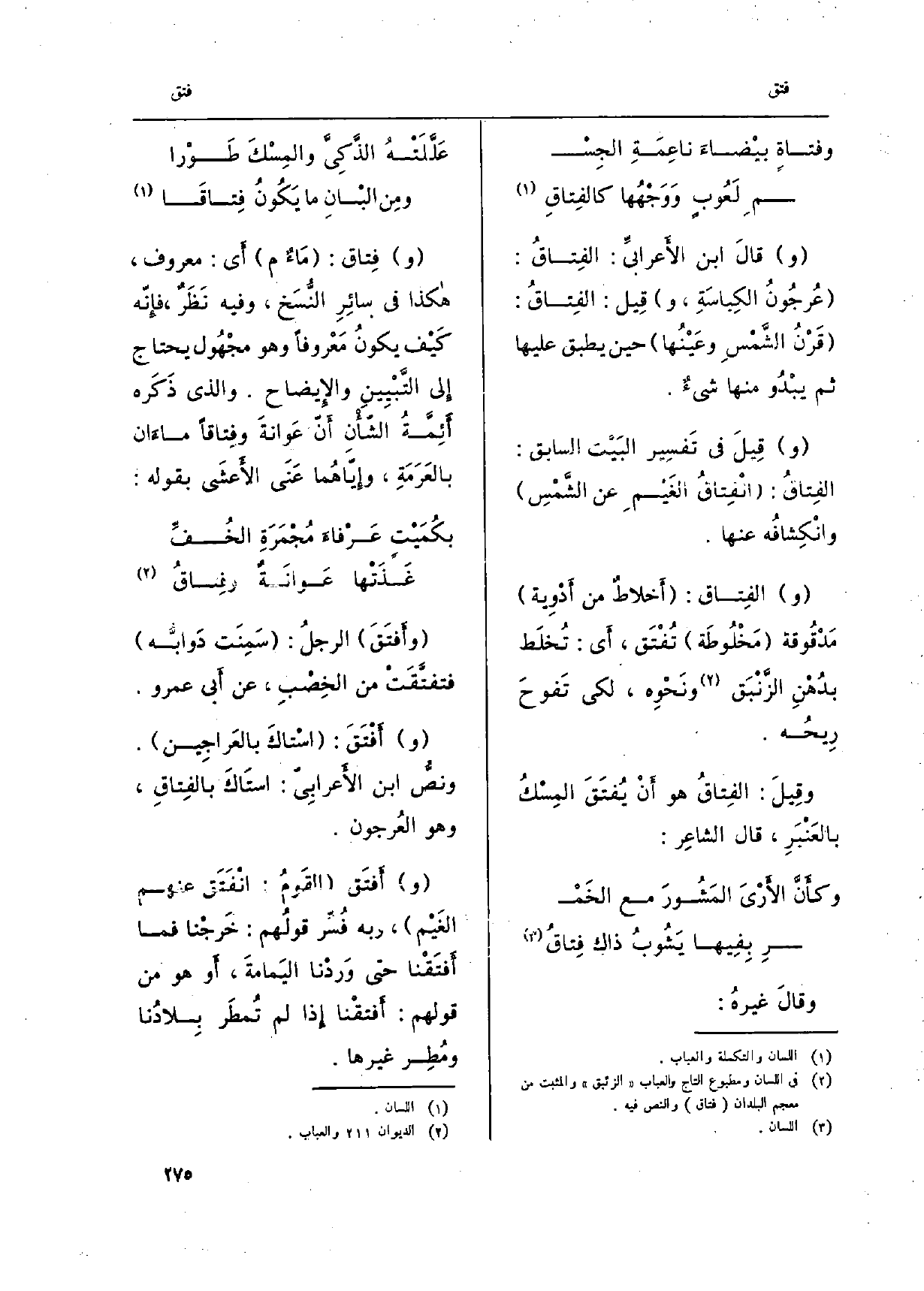 (علّلَتْهُ الذّكيَّ والمِسْكَ طوْراً ... وَمن البانِ مَا يكونُ فِتاقا)
