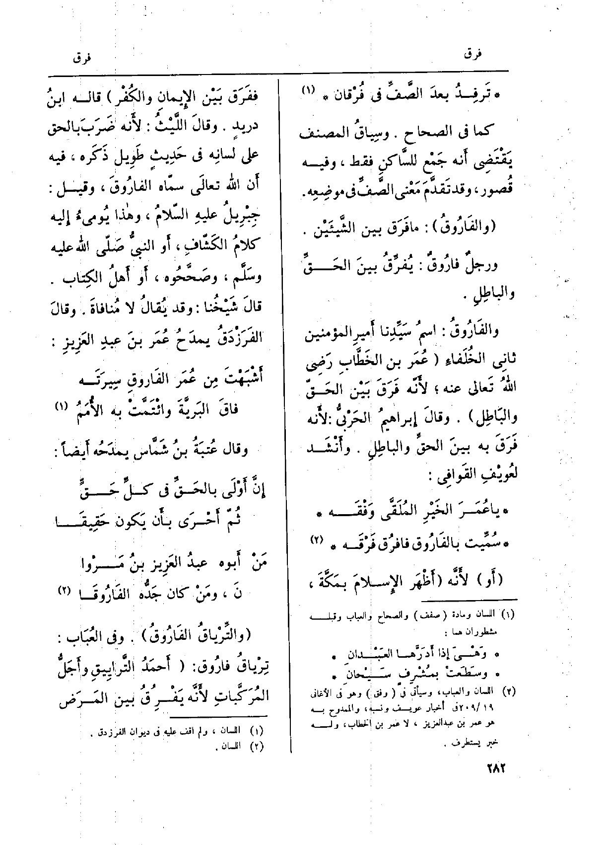 والفاروقُ: اسمُ سيّدِنا أميرِ الْمُؤمنِينَ ثَانِي الخُلَفاءِ عُمَر بن الخطّاب رَضِي الله تَعَالَى عَنهُ لأنّه فرَقَ بيْن الحقّ والباطِل. وَقَالَ إبراهيمُ الحَرْبيّ: لِأَنَّهُ فَرَق بِهِ بَين الحقِّ وَالْبَاطِل. وأنشدَ لعُويْفِ القَوافِي: يَا عُمَرَ الخَيْرِ المُلَقّى وَفْقَه سُمِّيت بالفاروق فافرُق فرْقَه أَو لأنّه أظهَر الإسلامَ بمكّةَ، ففَرَق بيْن الْإِيمَان والكُفْر قَالَه ابنُ دريدٍ. وَقَالَ الليْثُ: لِأَنَّهُ ضرَبَ بِالْحَقِّ على لسانِه فِي حديثٍ طَوِيل ذكَره، فِيهِ أَن الله تعالَى سمّاه الفاروقَ، وَقيل: جِبْريلُ عَلَيْهِ السّلامُ، وَهَذَا يومِئُ إِلَيْهِ كلامُ الكشّافِ، أَو النّبيُّ صلّى الله عَلَيْهِ وسلّم، وصحّحوه، أَو أهلُ الكِتاب. قَالَ شيخُنا: وَقد يُقال: لَا مُنافاةَ. وَقَالَ الفَرَزْدَق يمدَحُ عُمَر بنَ عبدِ العَزيز:)
