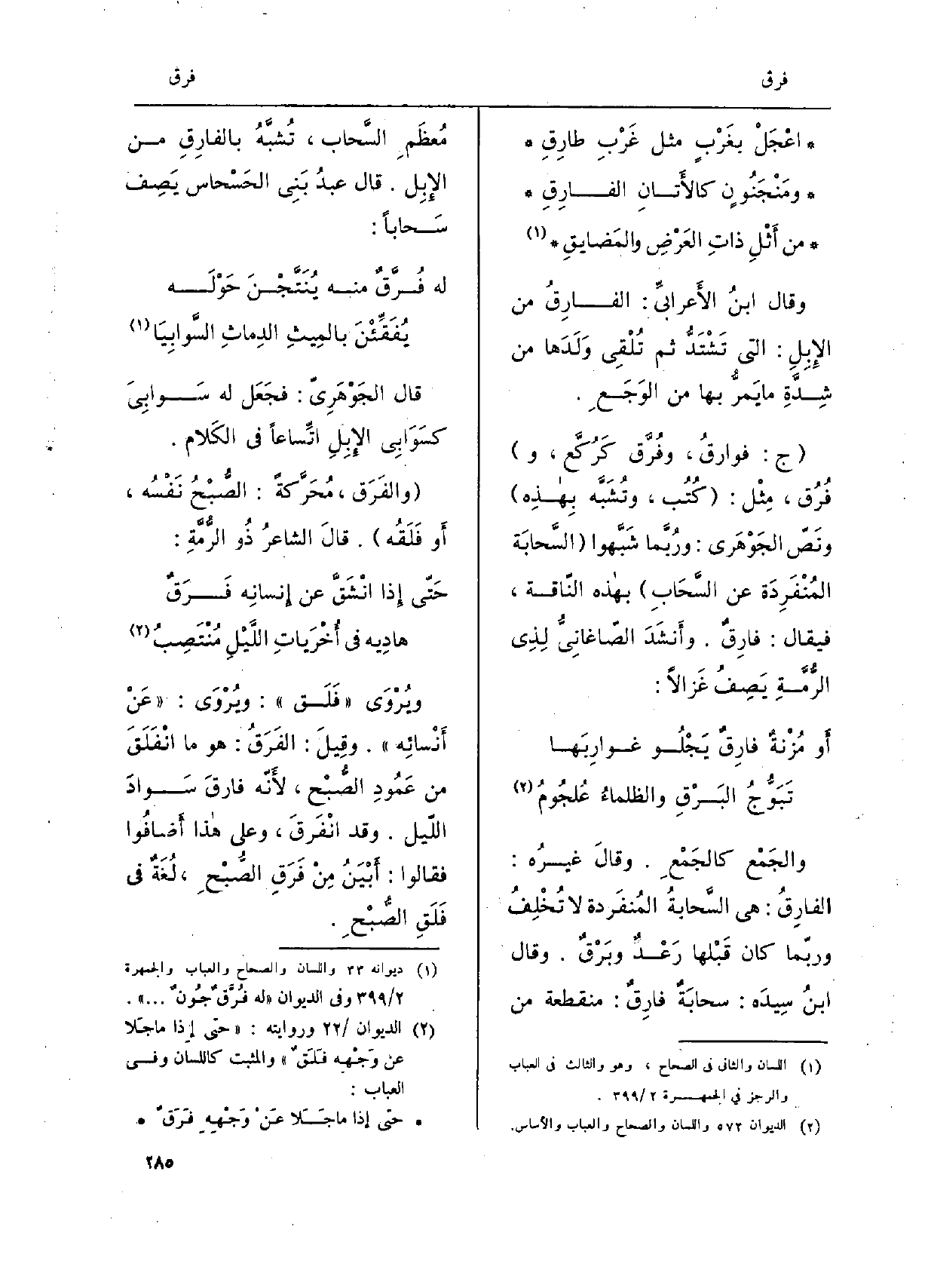 اعْجَلْ بغَرْبٍ مثل غرْبِ طارِقِ ومَنْجَنونٍ كالأتانِ الفارِقِ من أثْلِ ذاتِ العَرْضِ والمَضايقِ وَقَالَ ابنُ الأعرابيّ: الفارِقُ من الإبِل: الَّتِي تشْتَدُّ ثمَّ تُلْقِي ولَدَها من شِدّةِ مَا يَمرّ بهَا من الوَجَع. ج: فوارقُ، وفُرَّق كرُكَّع، وفُرُق، مِثْل: كُتُب، وتُشَبَّه بهذهِ ونصّ الجوهَري: ورُبّما شبّهوا السحابَة المُنْفَرِدة عَن السّحابِ بِهَذِهِ النّاقة، فَيُقَال: فارِقٌ. وأنشَد الصّاغانيُّ لِذي الرُمّة يصِف غزالاً: