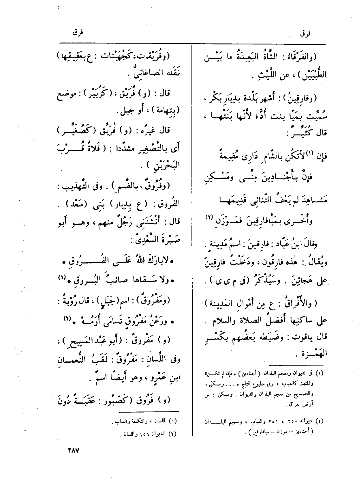وَقَالَ ابنُ عبّاد: فارِقين: اسمُ مَدينة. ويُقال: هَذِه فارِقون، ودخَلْتُ فارِقينَ على هَجائِنَ. وسيُذكَر فِي م ي ي. والأفْراقُ: ع مِن أموالِ المَدينة على ساكنِهاأفضلُ الصَّلَاة وَالسَّلَام. قَالَ ياقوت:)