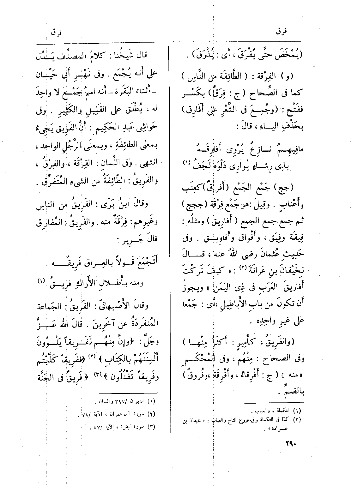 وَقَالَ الأصْبهانيّ: الفَريقُ: الجَماعة المُنفردَةُ عَن آخَرين. قَالَ الله عزّ وجلّ:) وإنّ منْهُم لَفَريقاً يَلْوونَ ألْسِنَتَهم بالكِتاب ففَريقاً كذّبْتُم وفَريقاً تَقْتُلون فَريقٌ فِي الجنّة