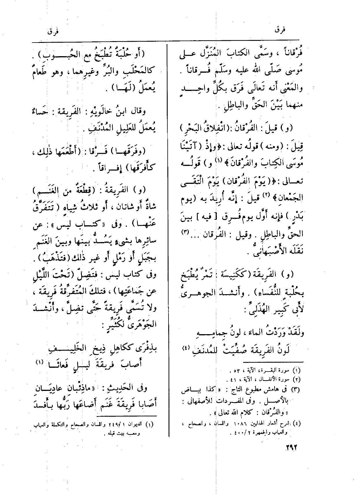 فُرْقاناً، وسمّى الكتابَ المنزَّلَ على مُوسَى صلّى الله عَلَيْهِ وسلّم فُرقاناً. والمَعْنى أَنه تَعالَى فرَقَ بكُلِّ واحِدٍ مِنْهُمَا بيْن الحقِّ والباطِل. وقيلَ: الفُرْقان: انْفِلاقُ البَحْرِ قيلَ: وَمِنْه قولُه تَعَالَى:) وإذْ آتَيْنا موسَى الكِتابَ والفُرْقان (وقولُه تَعَالَى:) يوْمَ الفُرْقان يوْمَ الْتَقَى الجَمْعان (قيل: إنّه أُريدَ بِهِ يَوْم بدْرٍ فإنّه أوّل يَوْم فُرِق فِيهِ بينَ الحقِّ والباطِلِ. وَقيل: الفُرقان ... نقلَه الأصبَهاني. والفَريقَة ككَنيسة: تمْرٌ يُطْبَخ بحُلْبَةٍ للنُّفَساءِ. وأنشدَ الجوهريّ لأبي كَبِير الهُذَليّ: